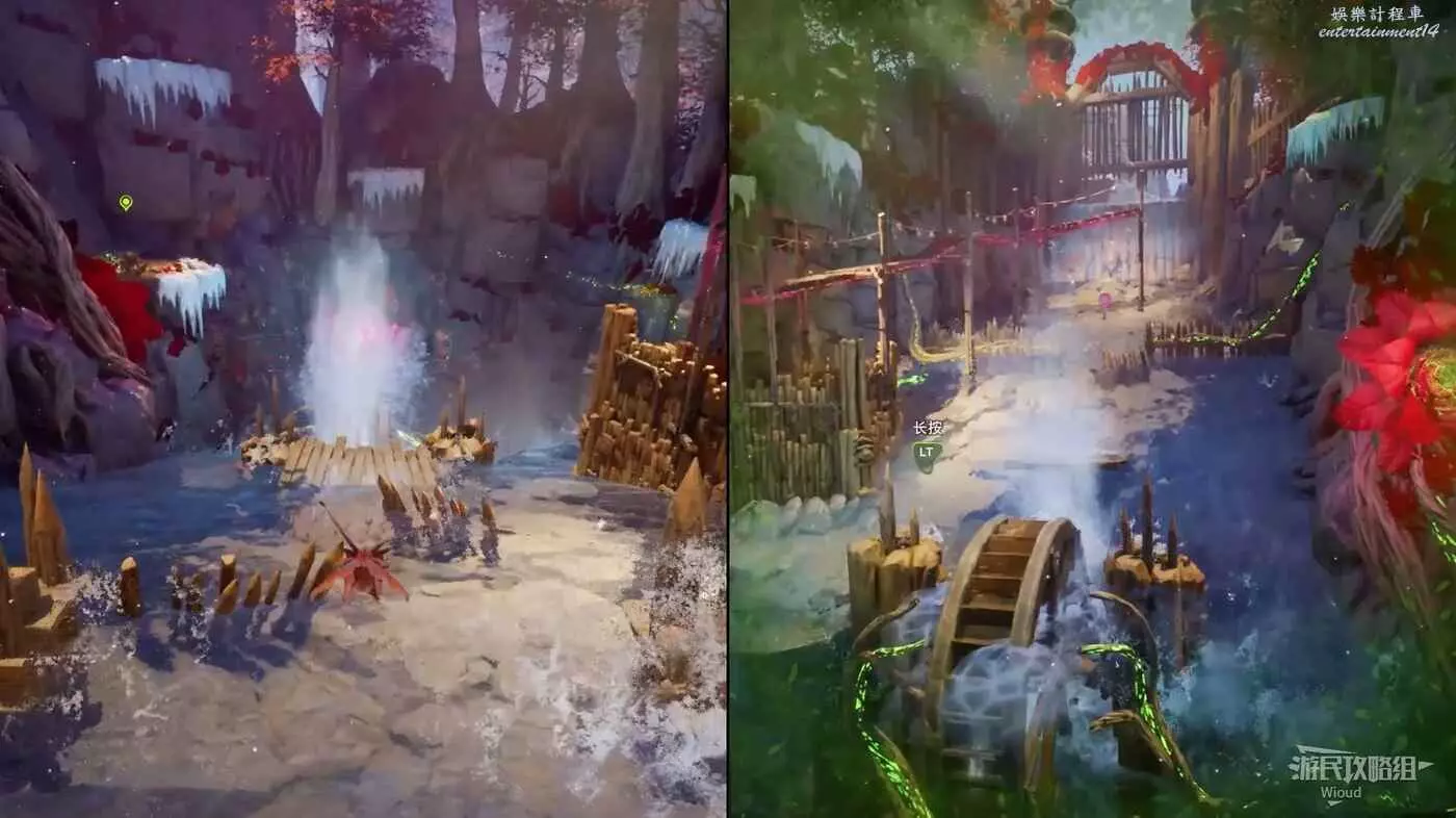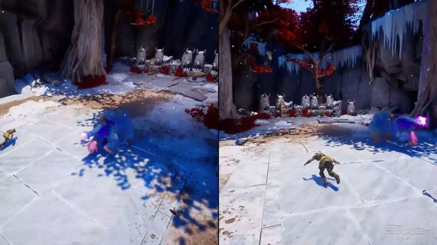 到達下一個場景,中間有個水池,首先變成魚進入水池往上扔冰球,另一個玩家拖拽冰球攻擊敵人。