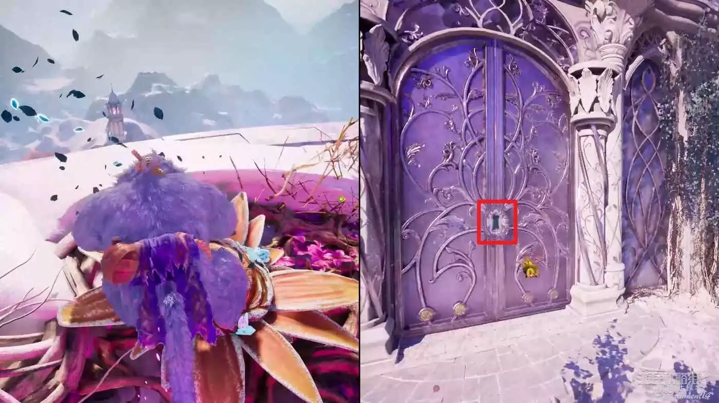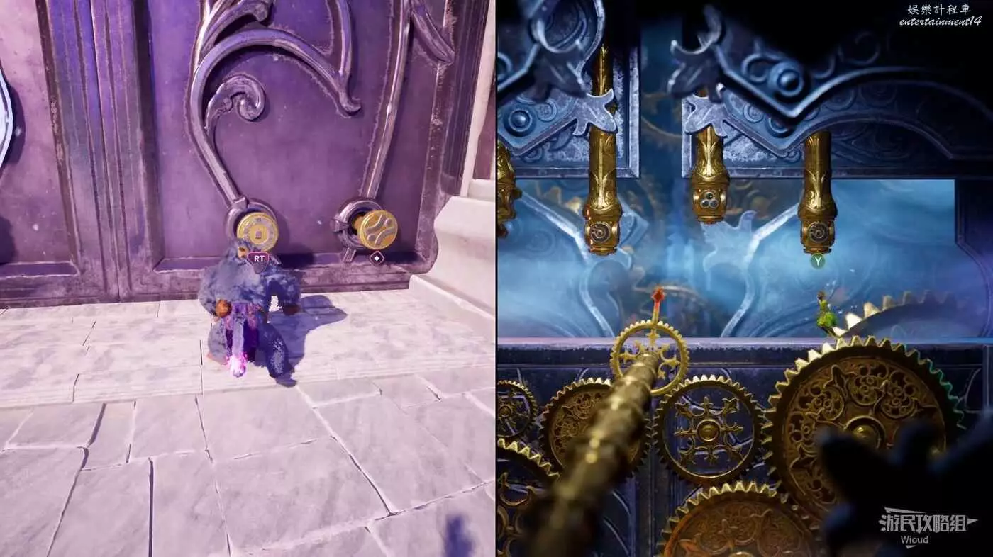 此處有一個開鎖謎題,首先讓仙女擺動中間的指針朝左,然後讓猩猩從左到右依次砸門口的按鈕,當猩猩砸按鈕時仙女這邊對應的機關會顫動,讓仙女將顫動的機關圖示轉為更猩猩砸的按鈕圖示相同,完事讓猩猩再砸一次按鈕,如果步驟正確按鈕會進入,重複四次此步驟完成解謎。