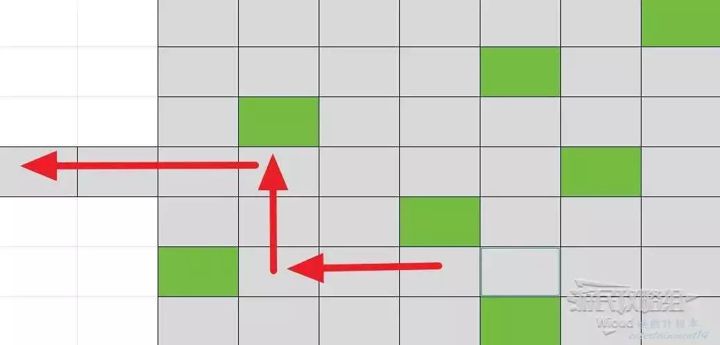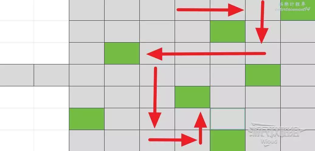 圖片解釋:綠框為樹人可以抬起地塊的格子,圖片上方對應宮殿入口,左側對應封閉的門。
