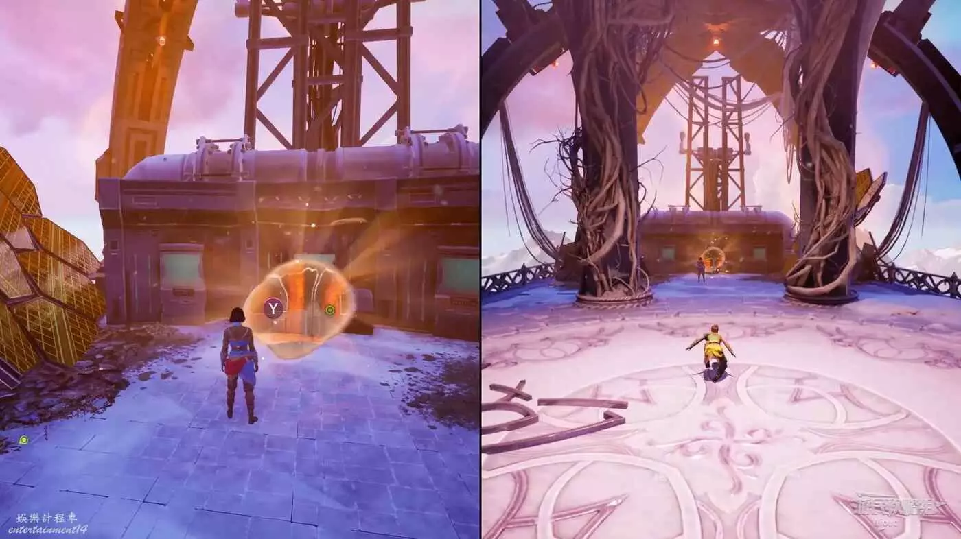 等待跟隨移動的柱子調整位置,等待最佳時機跳到柱子上,繼續移動,走到盡頭處倆人一起按下機關按鈕觸發新解謎。