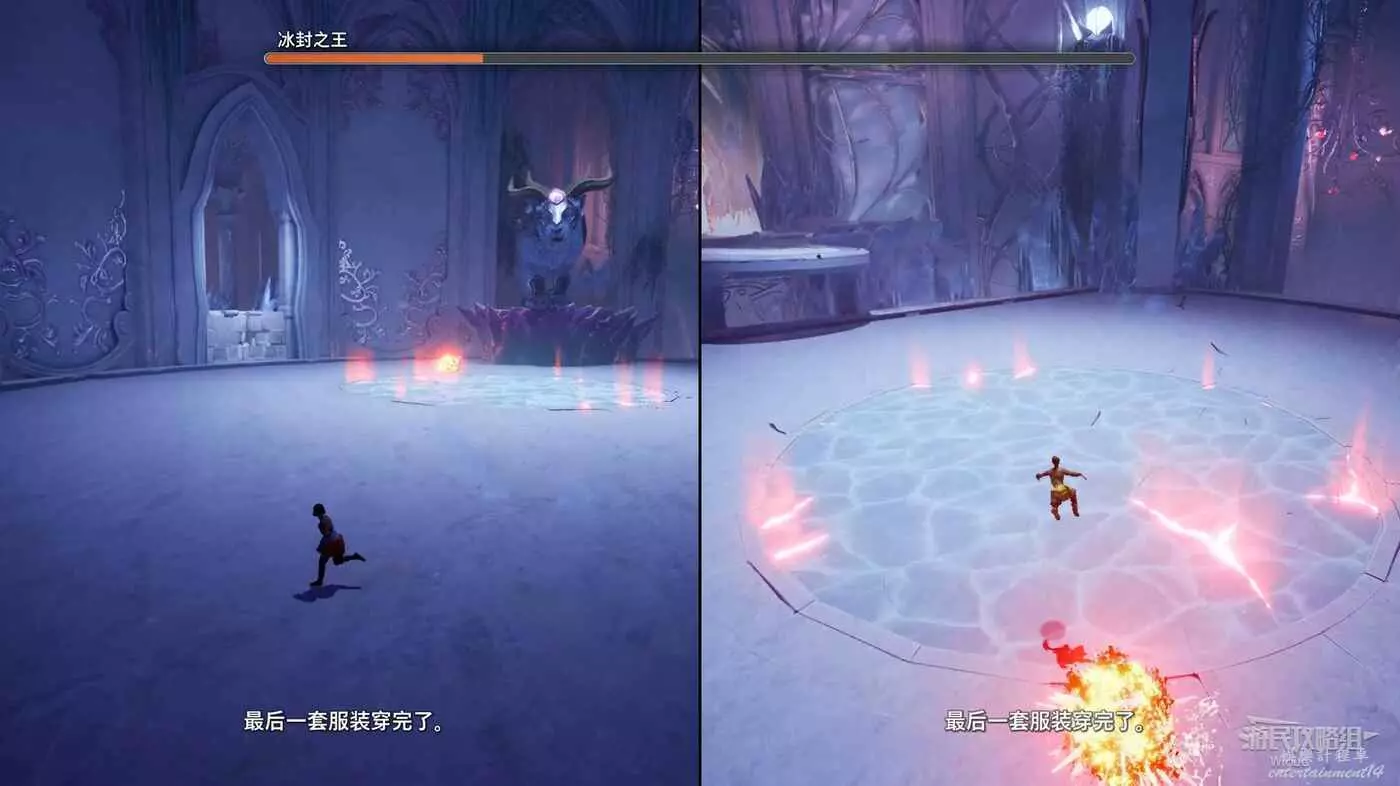 當BOSS血量過半時,它會把中間的水池凍住,注意BOSS釋放的火球招式,火球會在地面跟隨我們,我們需要將火球帶到冰面爆炸,迴圈幾次讓冰面融化繼續重複之前的步驟將其擊敗即可。