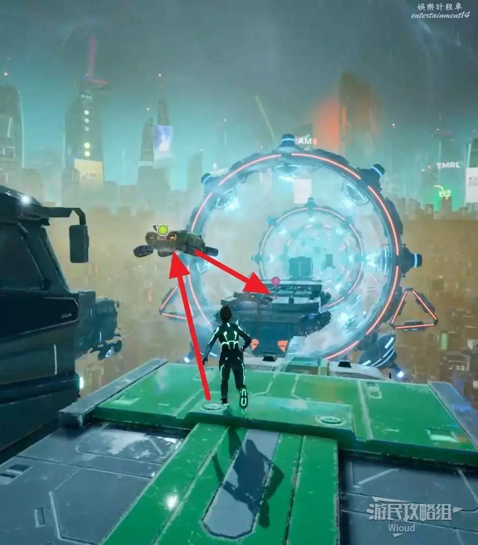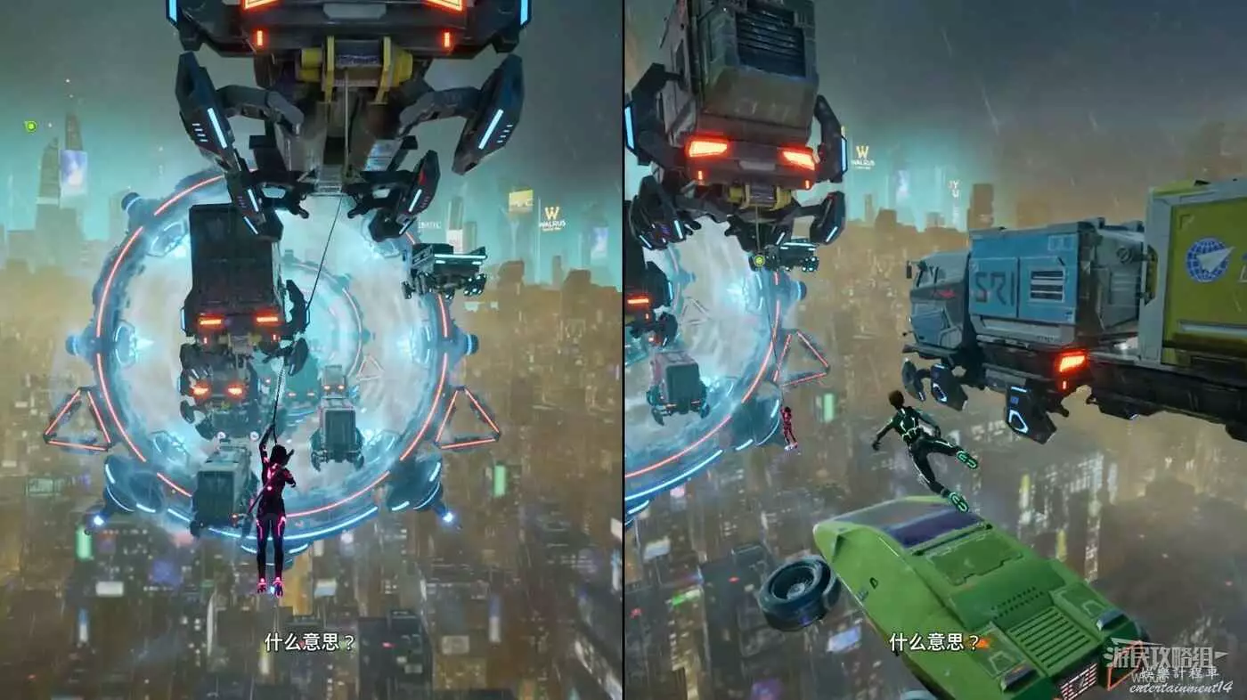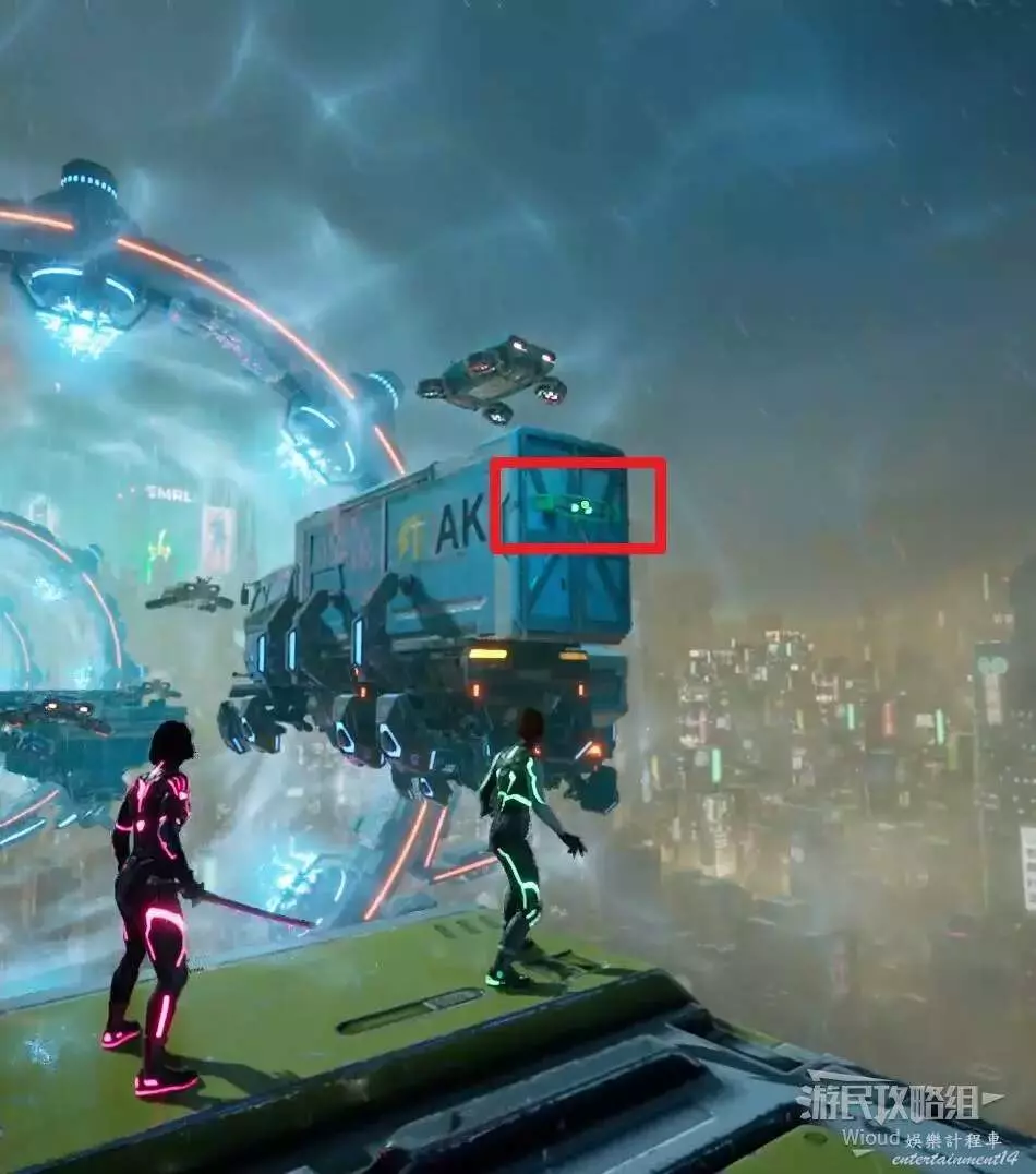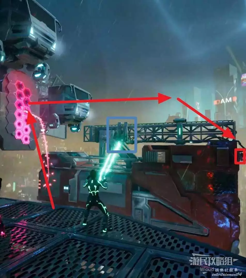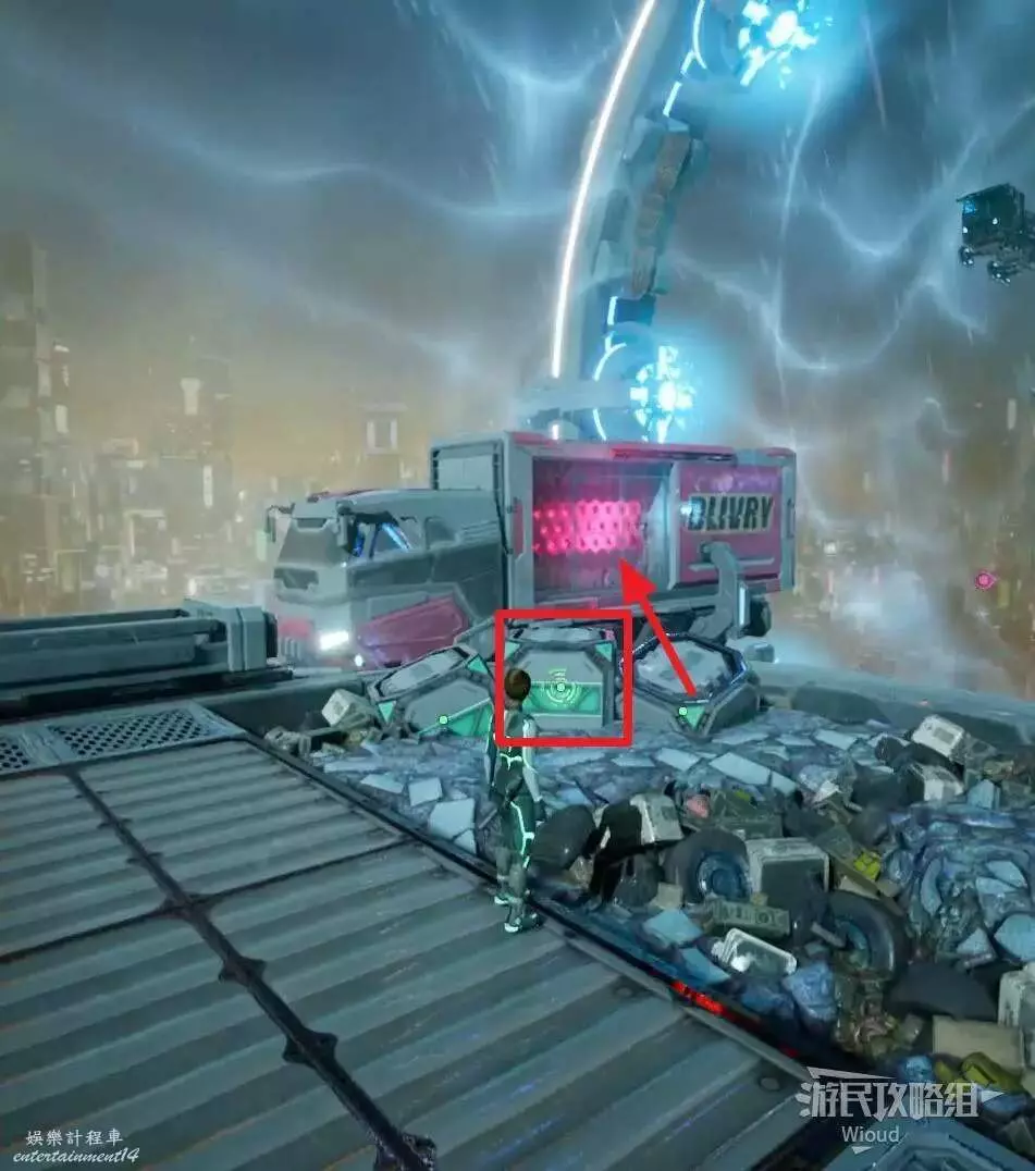 原地等待右前方的貨車移動過來,讓綠人使用能力將車廂大門打開製作一個鉤爪點。