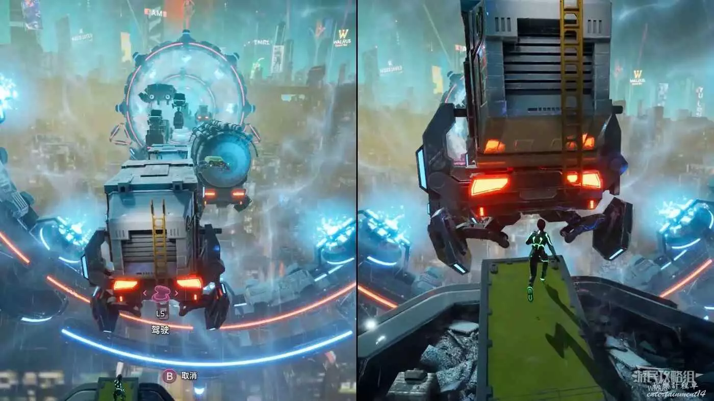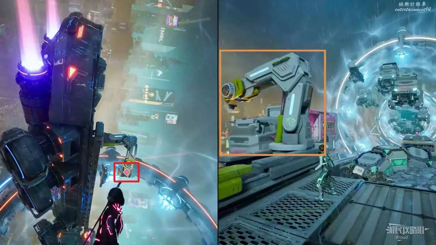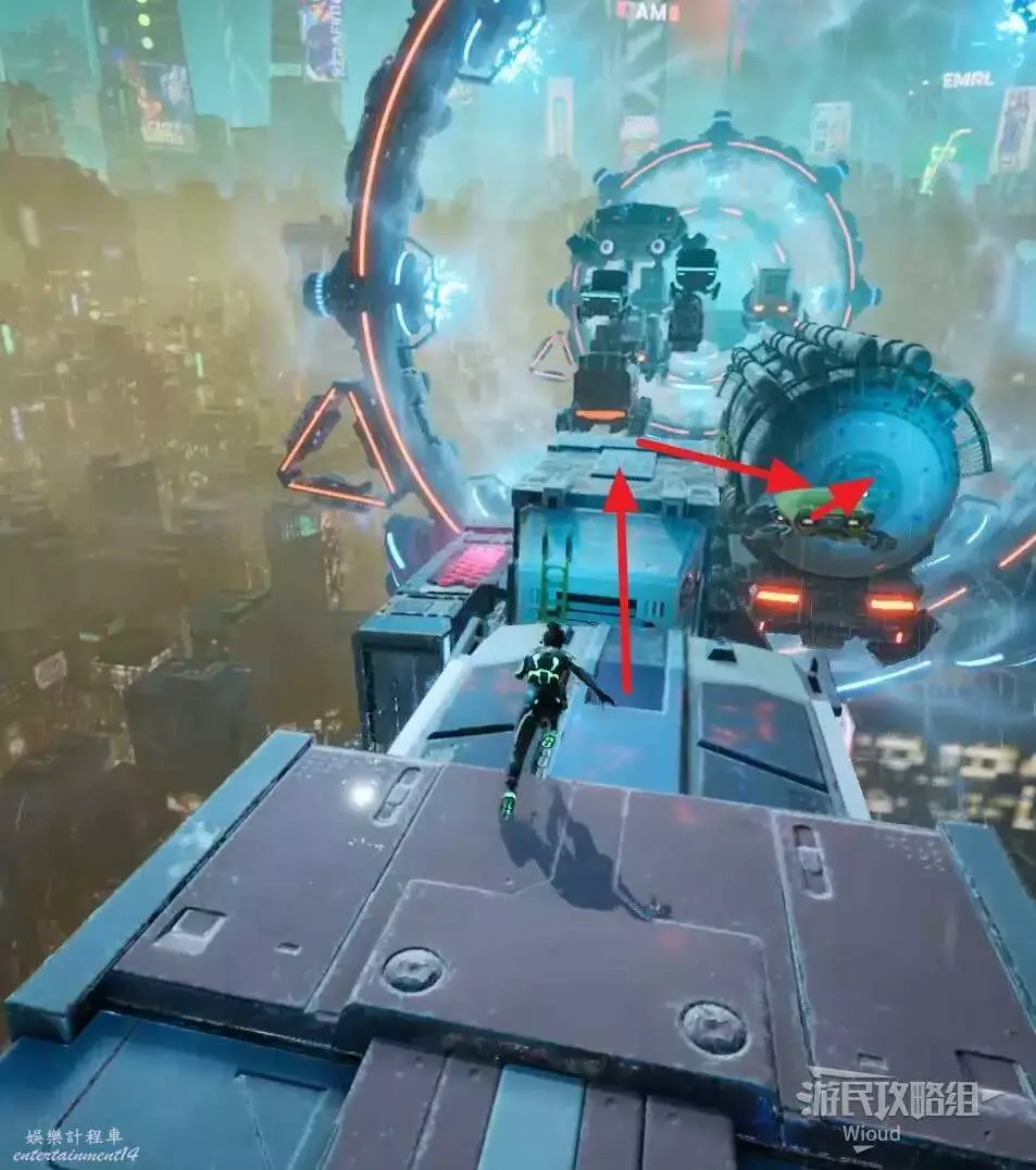 使用鉤爪跟過去,從車輛另一頭出來,沿著下圖路線一直跳到盡頭處的平台,兩個玩家合作與活板門互動觸發劇情。