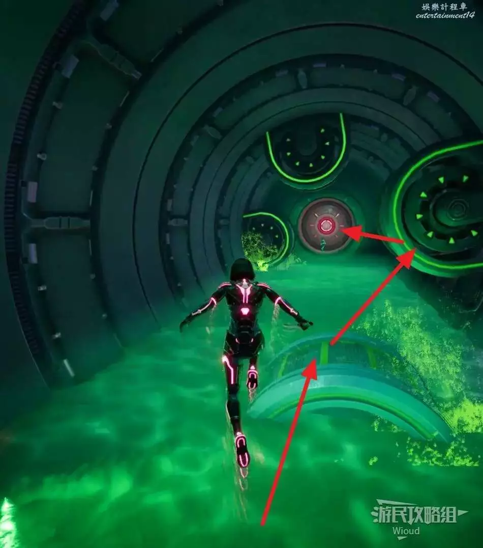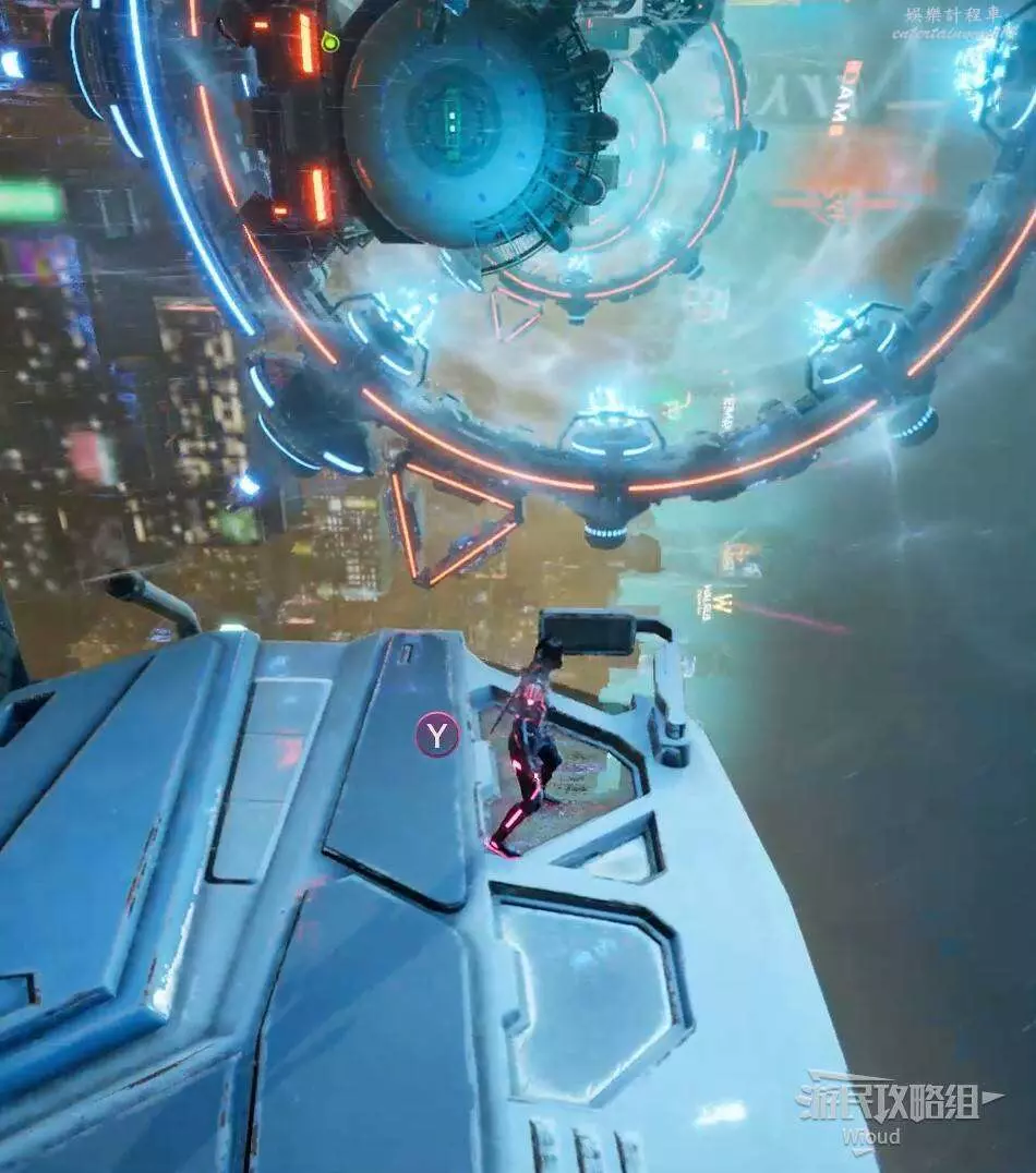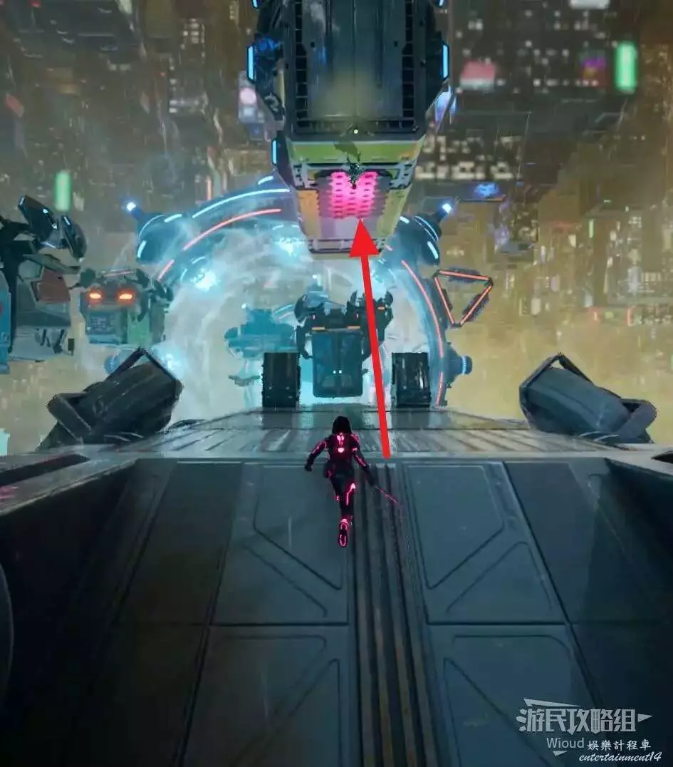 使用鉤爪跟過去,從車輛另一頭出來,沿著下圖路線一直跳到盡頭處的平台,兩個玩家合作與活板門互動觸發劇情。