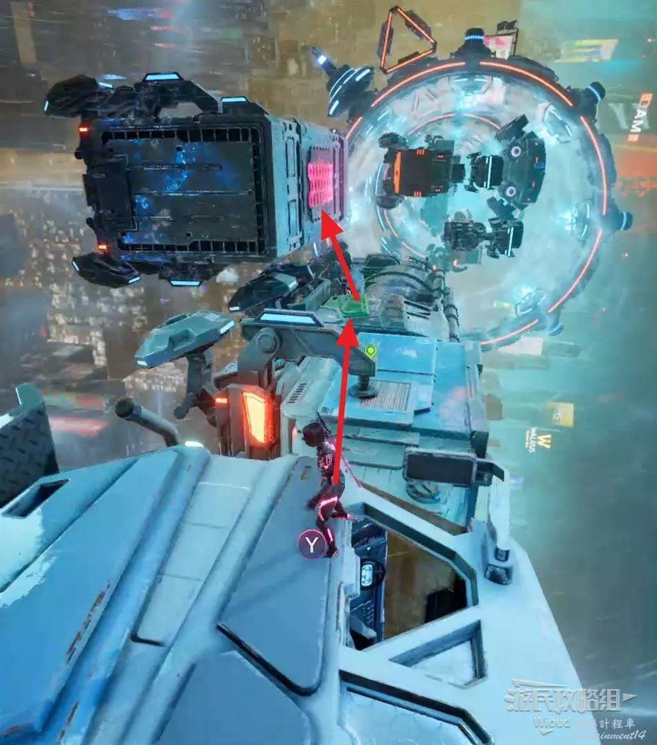 此時紫人需要移動到左前方的板塊上,通過旁邊的車做跳板,跟隨箭頭移動到車輛右側攻擊紅框所示的機關。