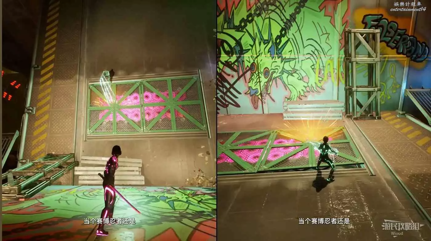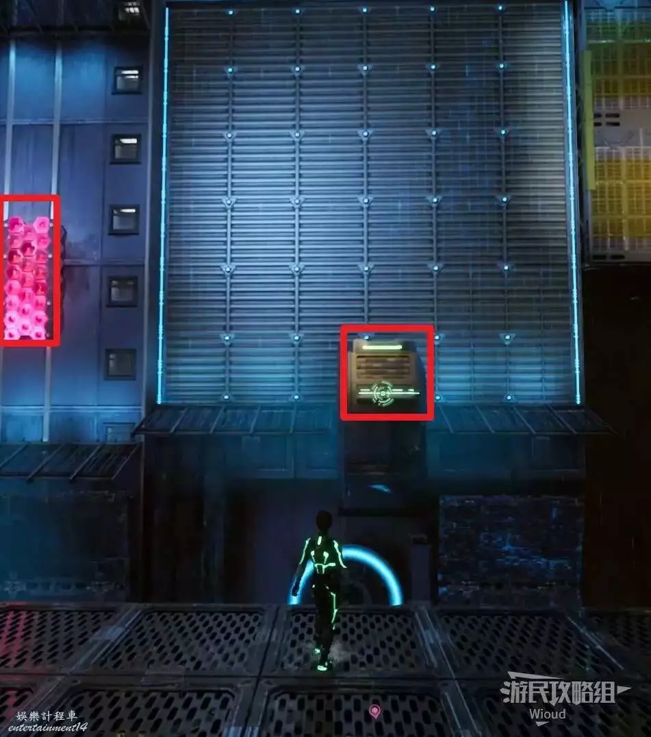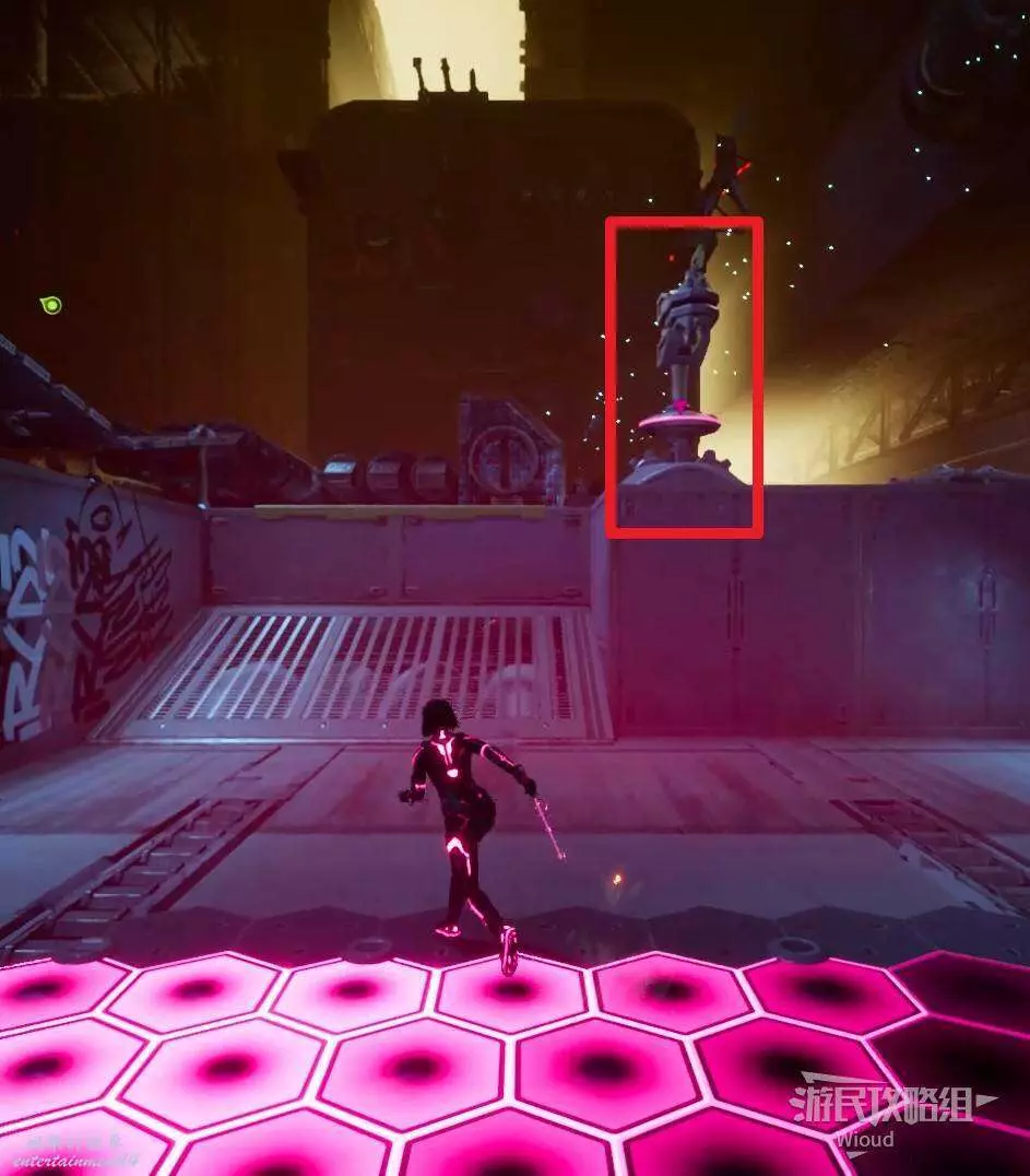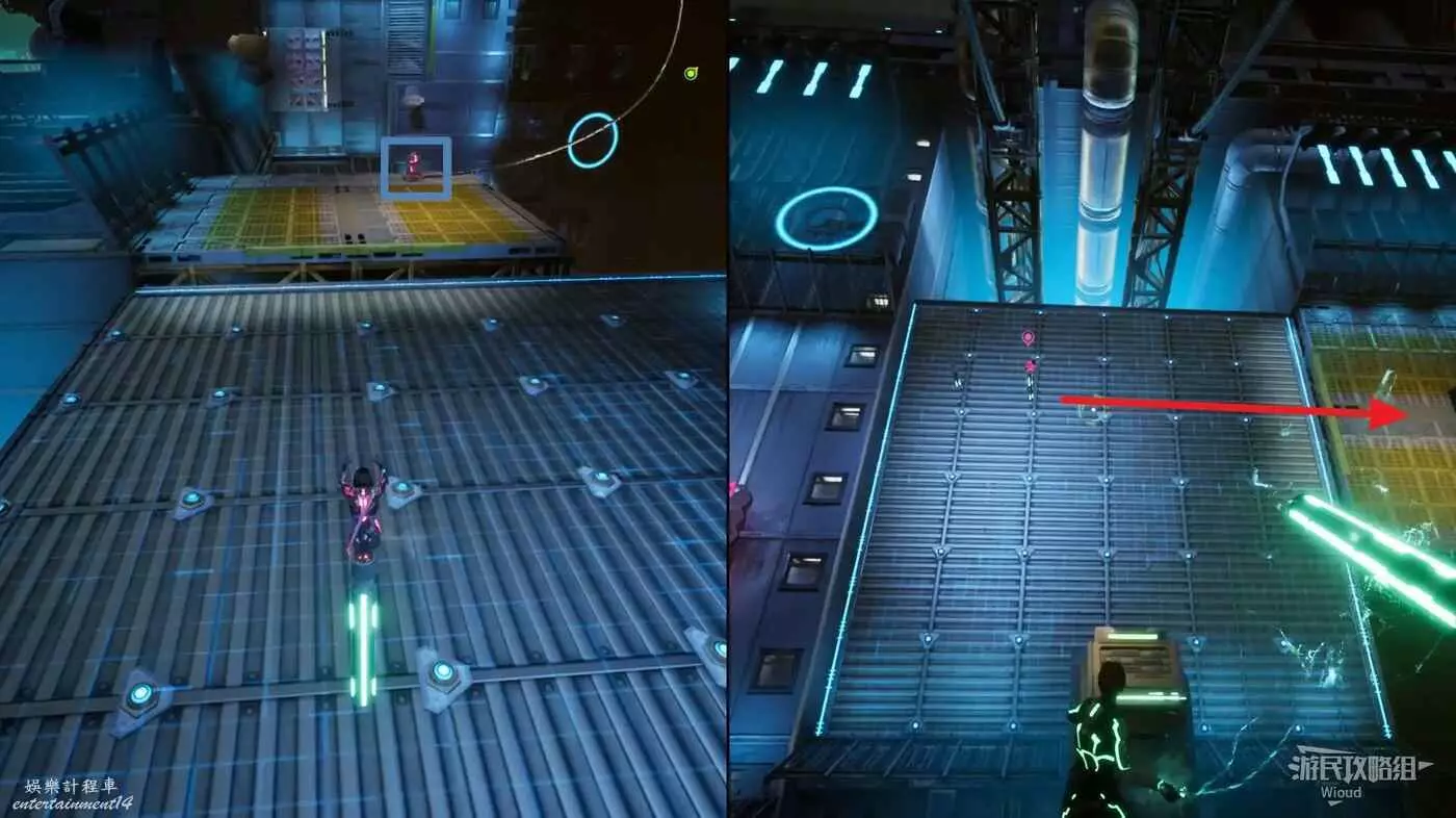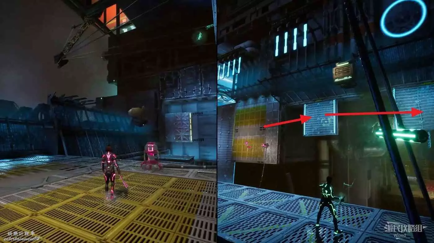 此時紫人需要依次攻擊前方的機關給綠人創造鉤爪點,讓綠人移動到前方平台。