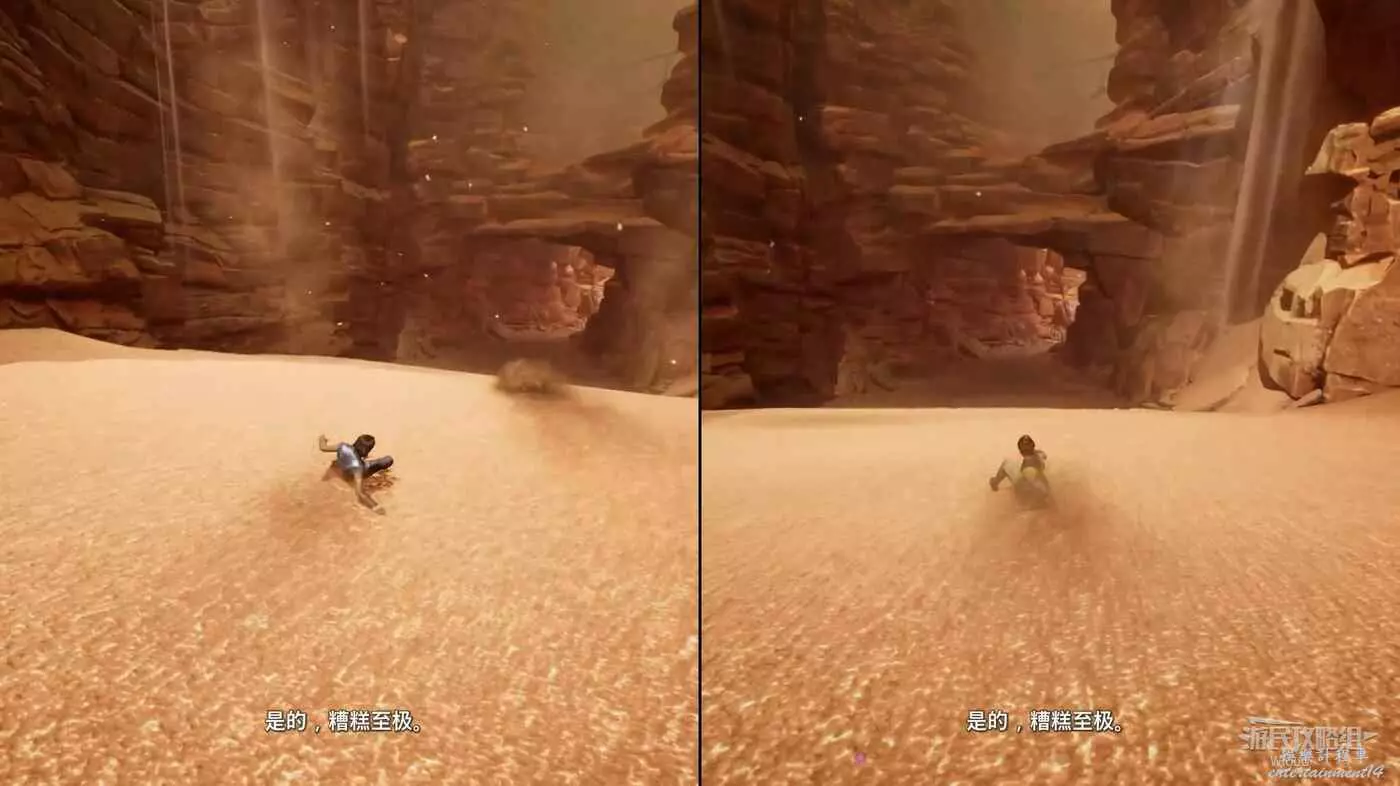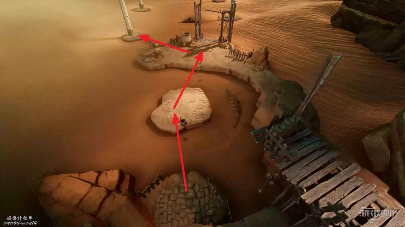 進入此支線直接滑沙到最底部,爬一段樓梯經過幾個鉤爪點,再滑沙一次到達機關位置。