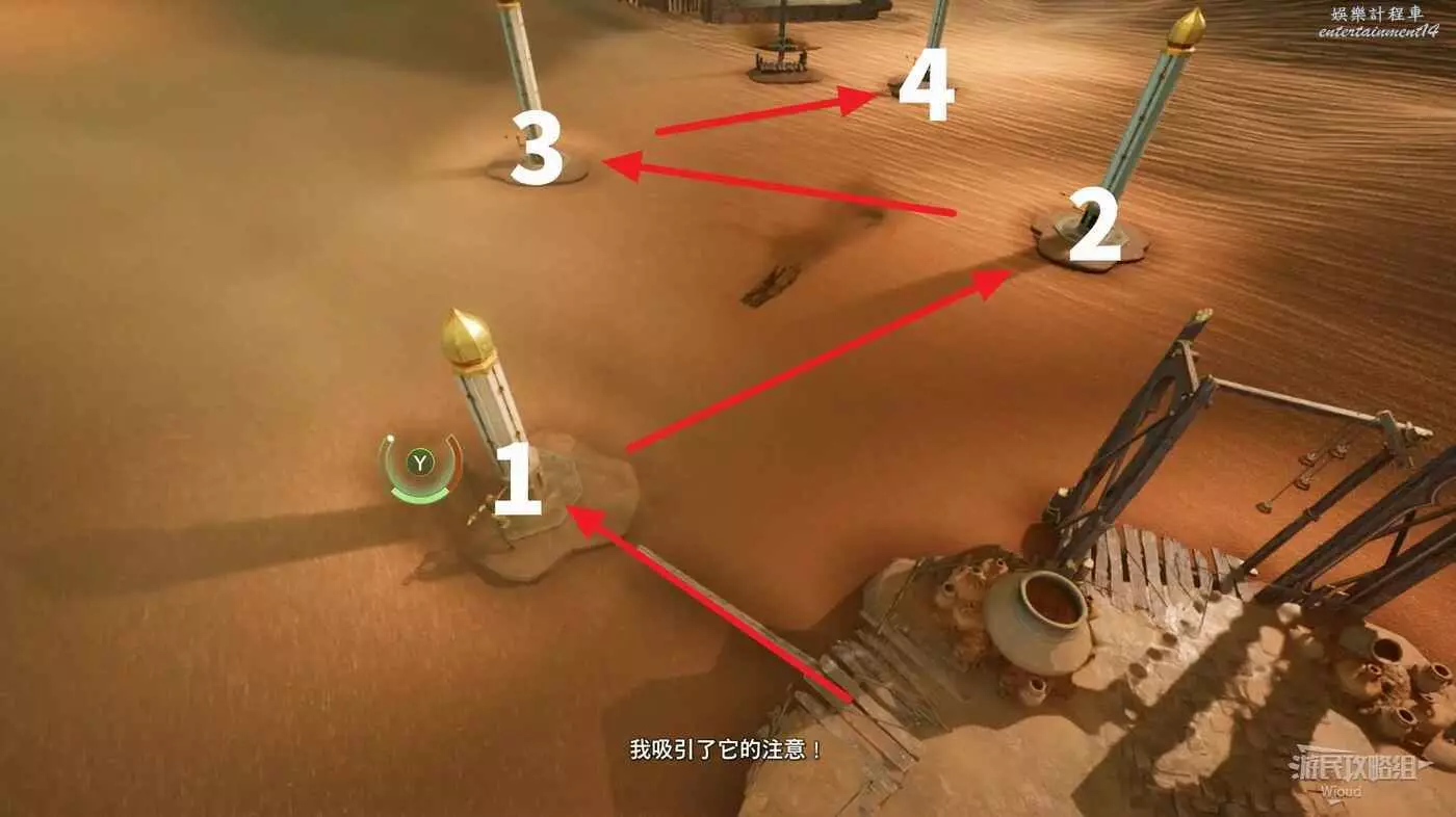 跟隨下圖箭頭移動到左前方的柱子旁。