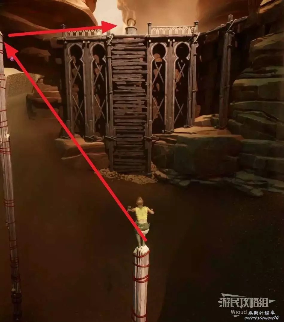 第三個平台直接跳到前面柱子上,再通過連跳和衝刺扒到左前方的柱子並爬到頂端,最後通過鉤爪移動到最高處的平台。