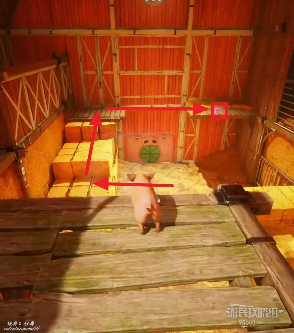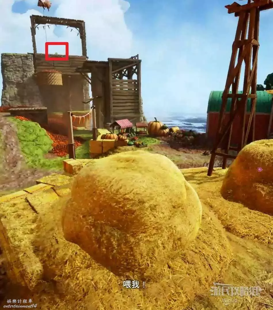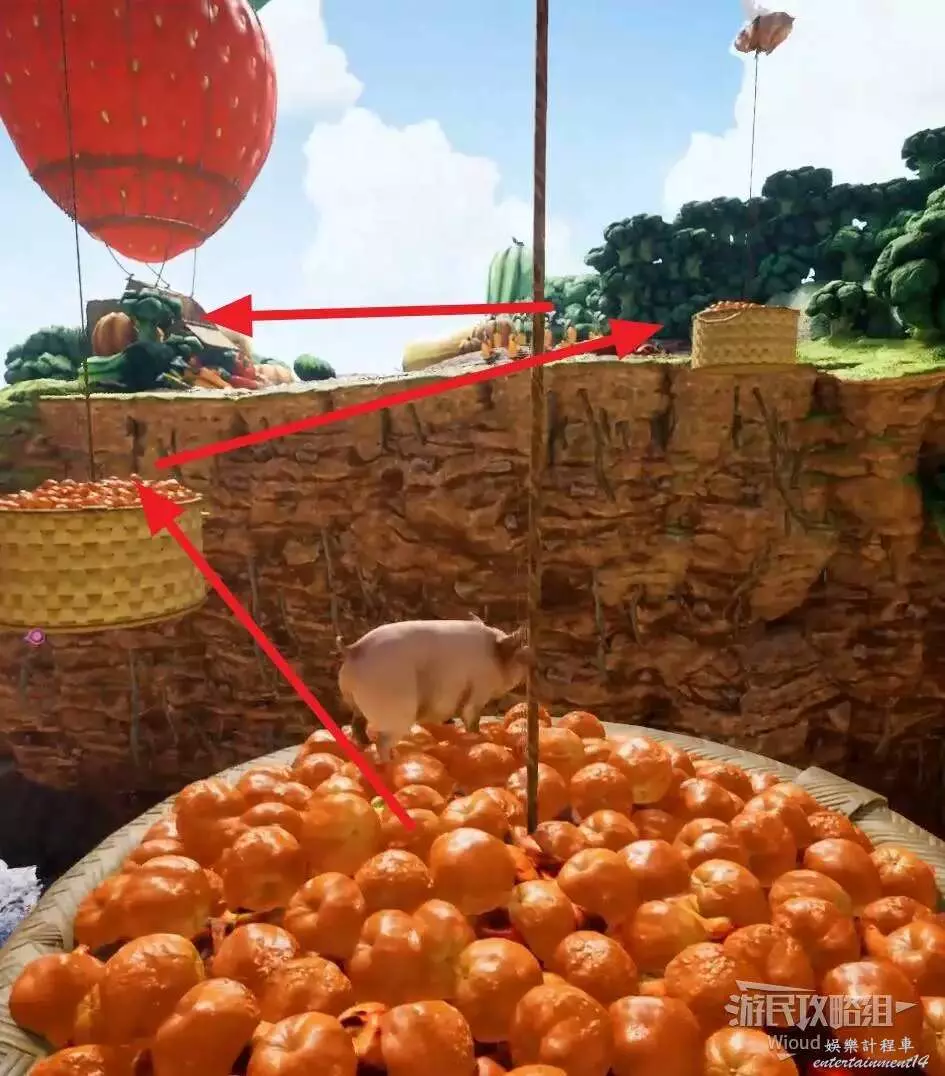 移動到高台下方,操控屁豬沿著下圖路線將左側高處的籃子弄下來。