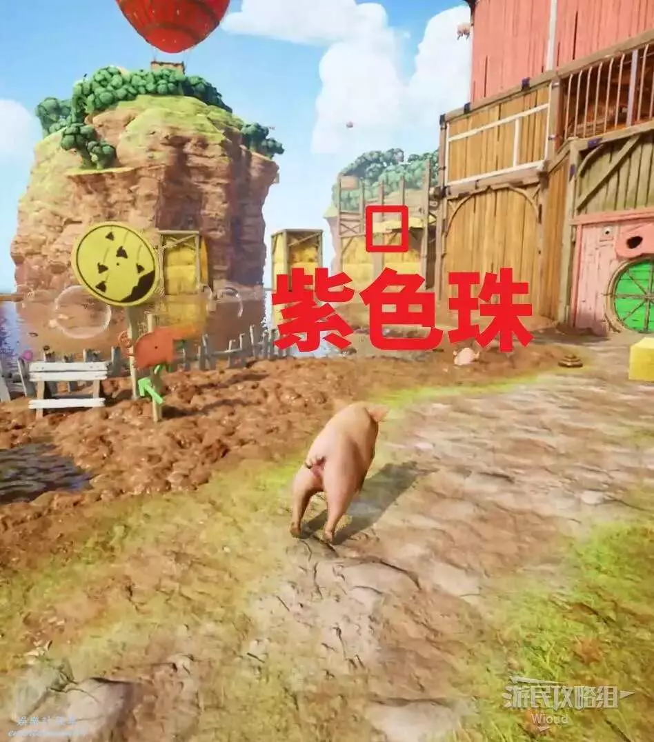 紫色珠屁豬可以直接拿到,來到綠色珠的位置,通過撞擊泡泡可以直接飛起來,然後在鐵色房頂使用技能上去拿到寶珠。