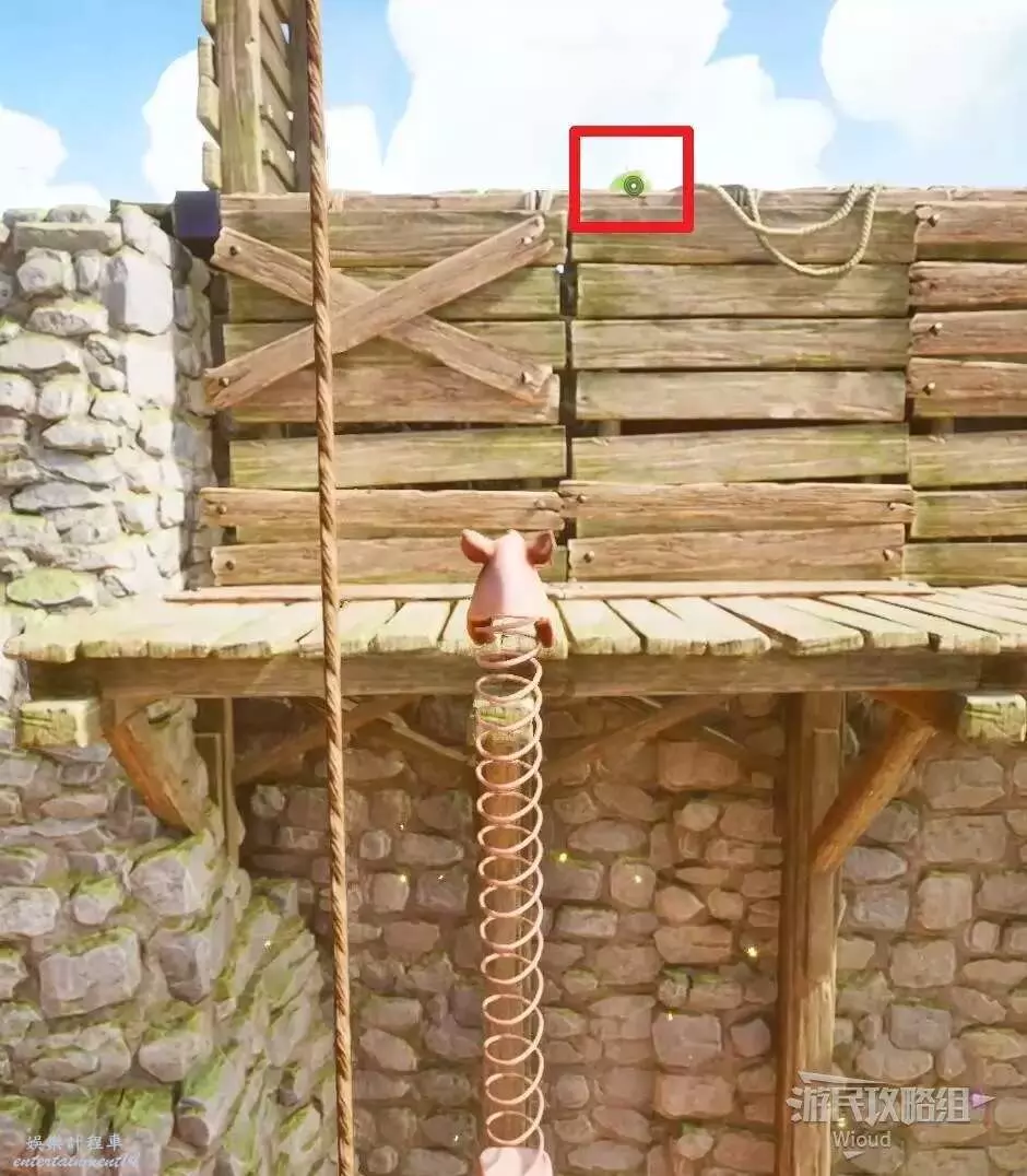 高台下面有一個蹺蹺板,讓彈跳豬站在翹起來的那一邊,使用技能將屁豬打上去。