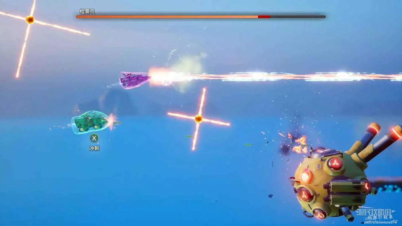 中間有各種漂浮的道具,拾取到可以臨時獲得更強的輸出,擊敗檢票員即可完成這個關卡。