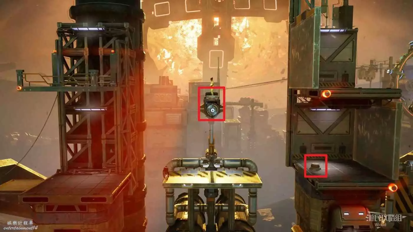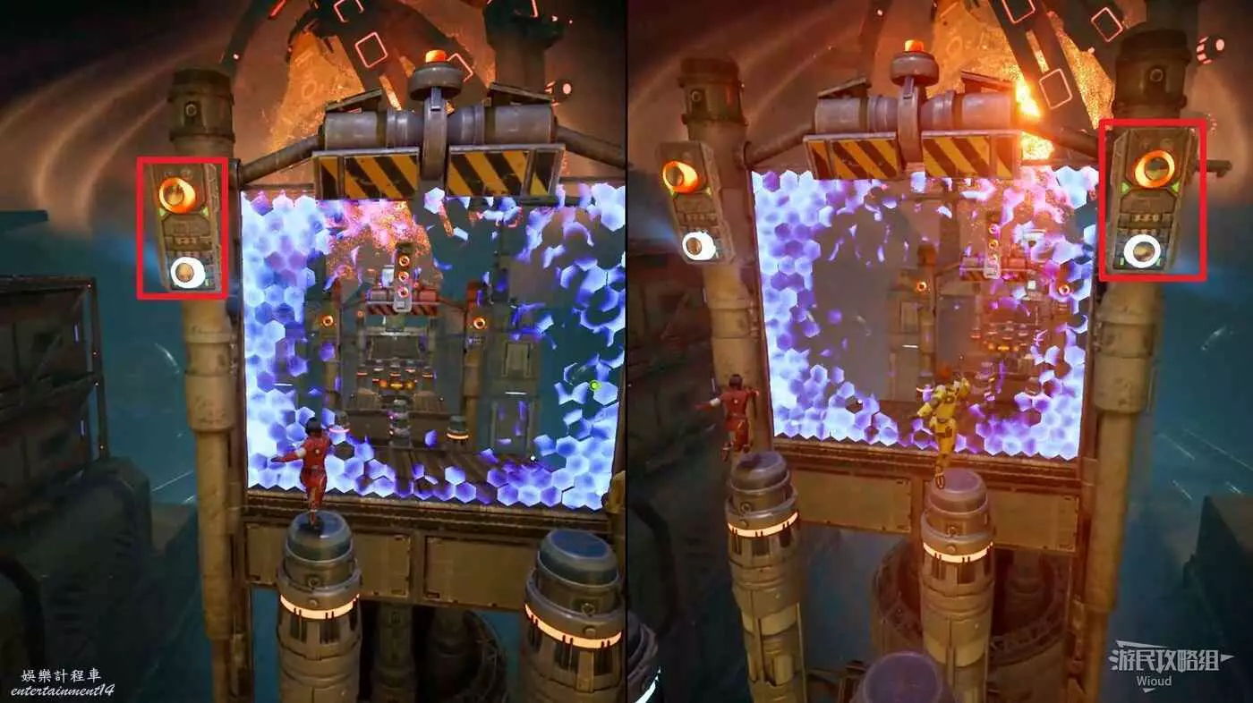 繼續移動,下一個需要配合的地點是防護罩的位置,玩家需要踩下中間的柱子啟動左上角與右上角的能量進度,也就是在爆炸來之前合作踩下所有格子阻擋傷害,繼續前進。