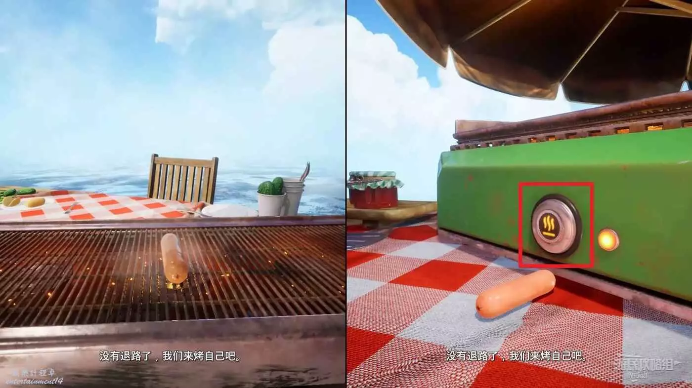 成功變成香腸後,打開桌子上的烤爐,通過鑷子跳到烤爐上面將自己烤熟。