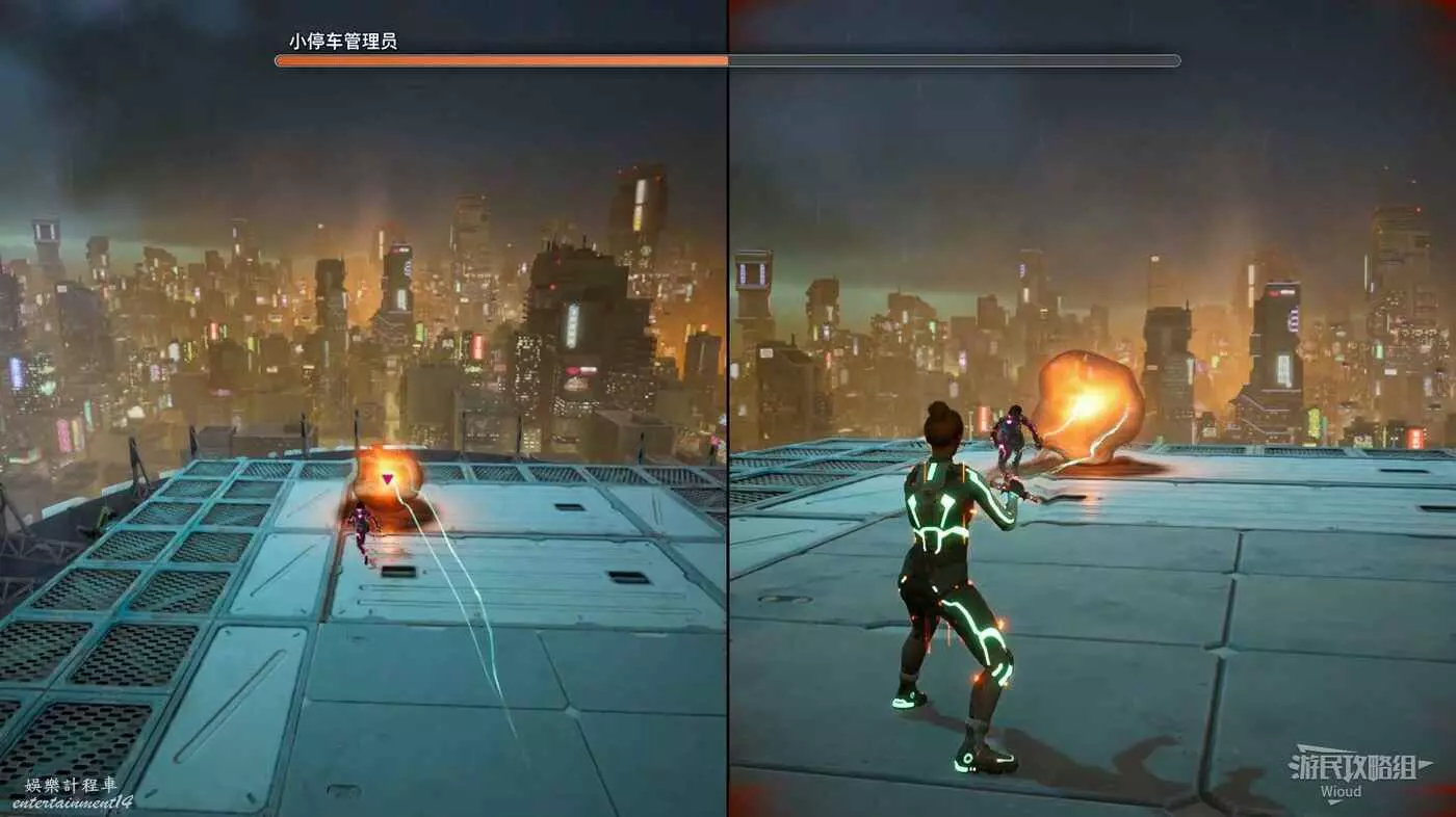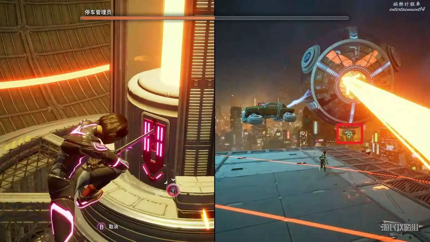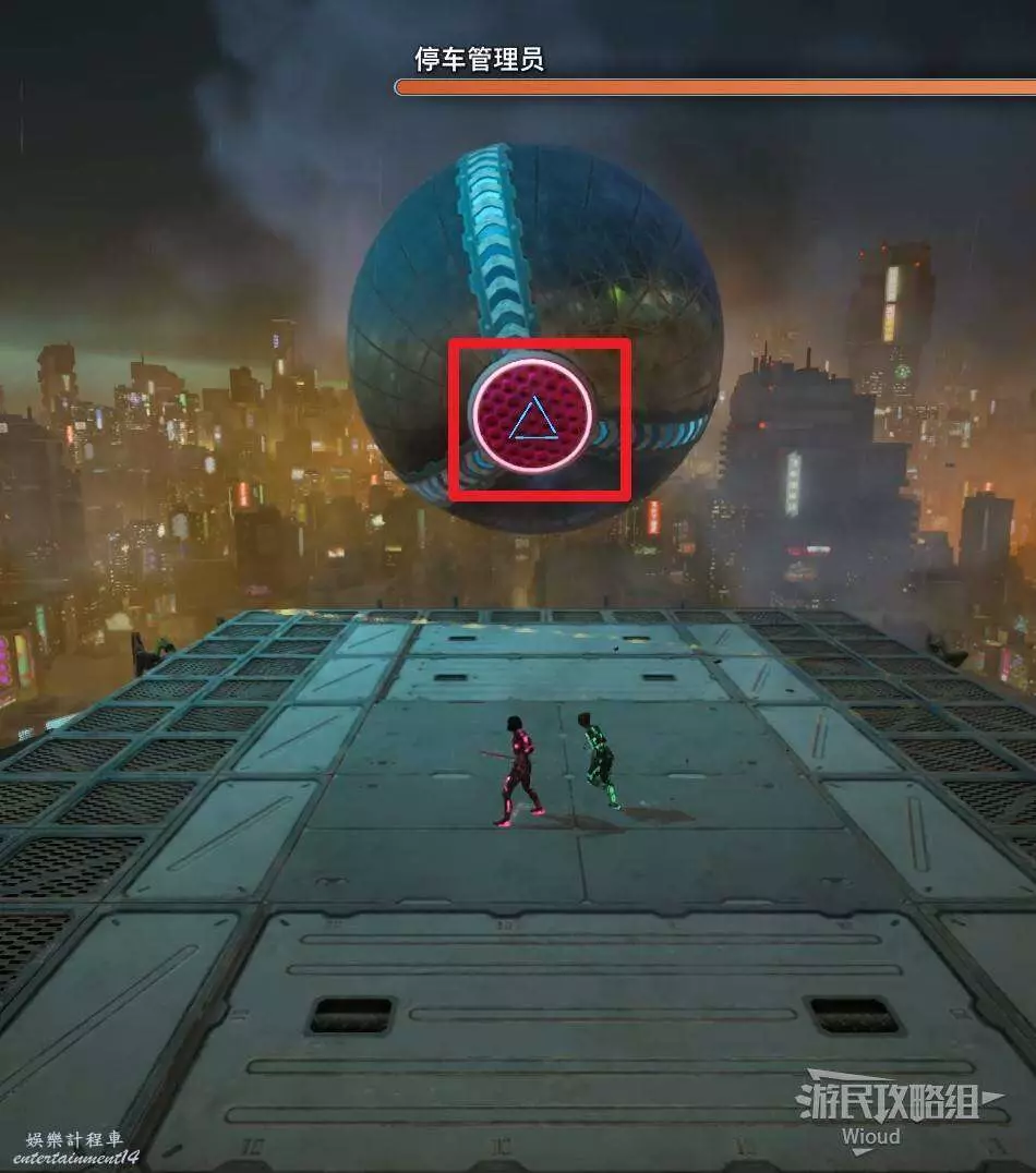 此時我們需要穿越各種障礙物移動到最高處的平台開啟與停車管理員的BOSS戰。