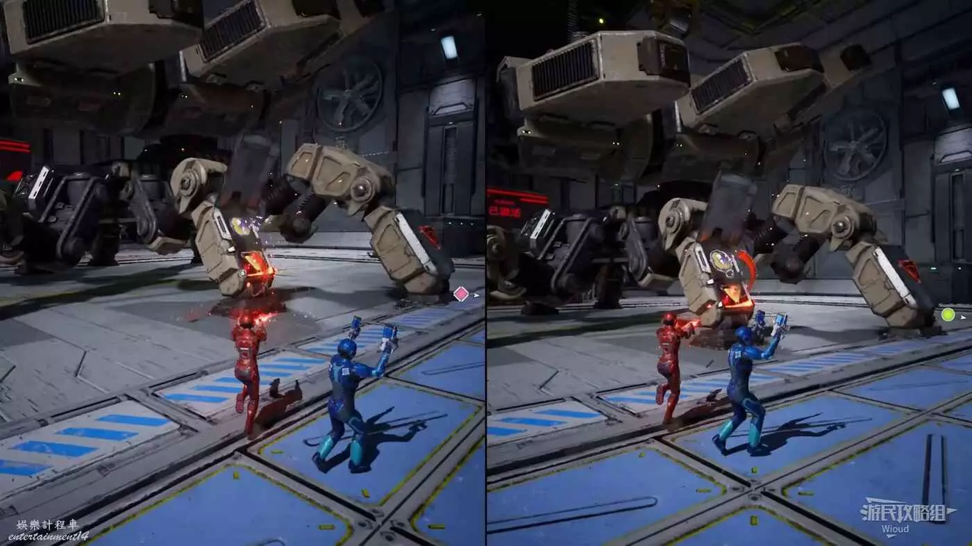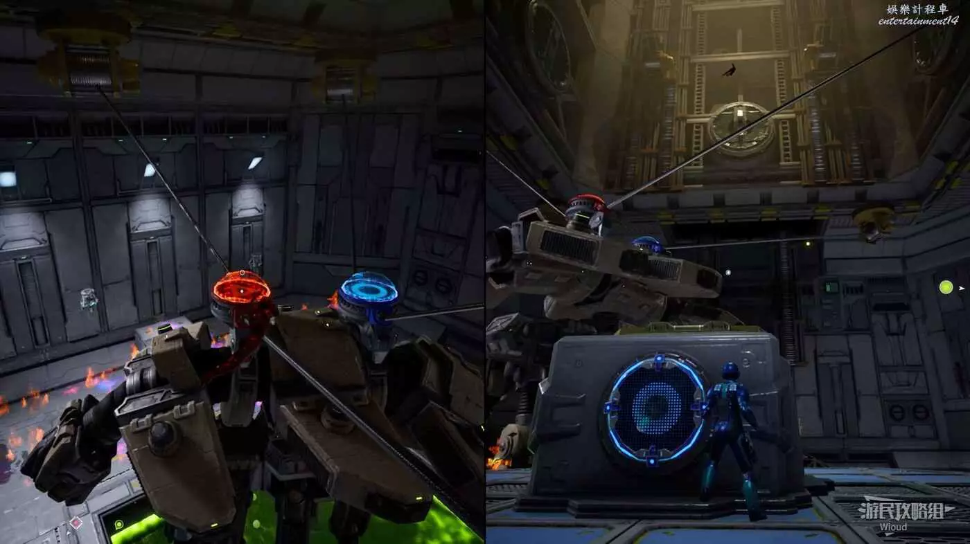 將兩個機關全部啟動後,有一個大型機器人BOSS出現,兩位元玩家需要合作攻擊某個腿上的單個顏色標誌,然後用相反顏色的爆破器炸開防護罩,再朝裡面的兩個標誌射擊即可炸掉敵人一條腿。