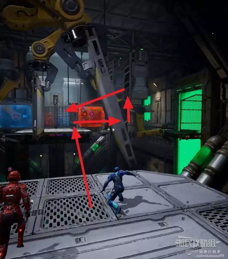 先讓藍玩家站到紅色月台的彈簧機關處,然後紅玩家先朝對面高處的紅色鐳射處扔一個爆破器,再射擊機關的紅色標誌讓藍色玩家往對面高處平台跳。