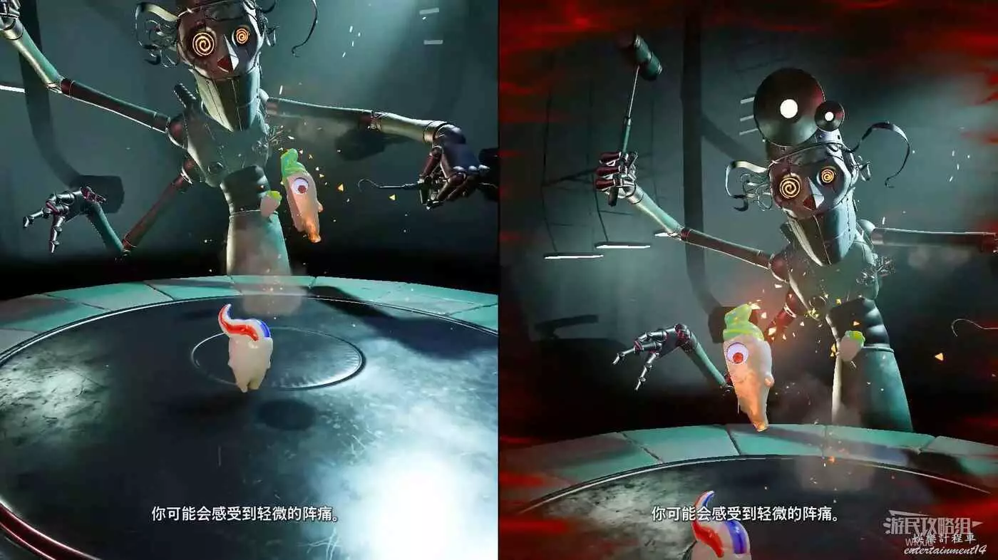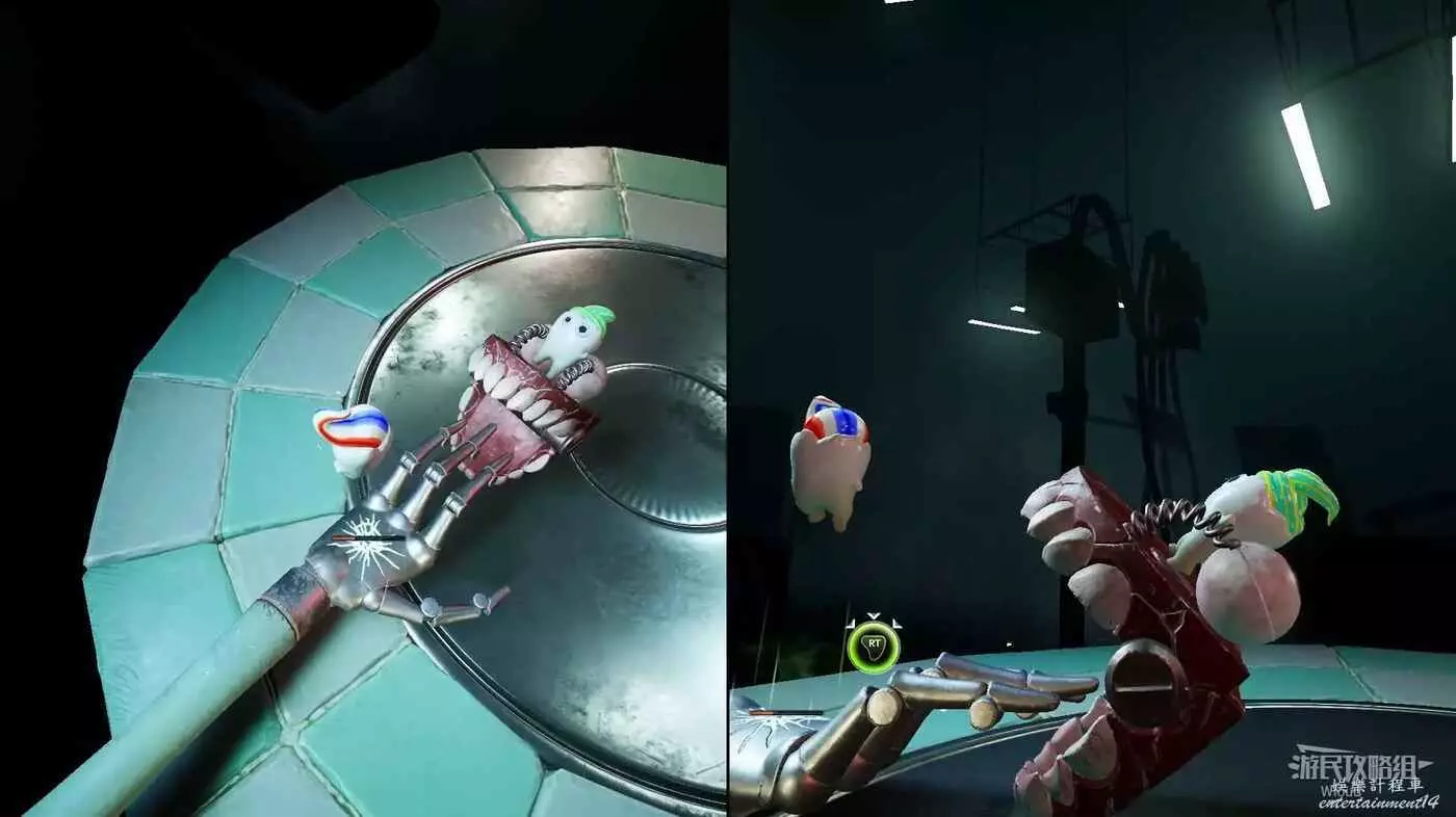 先專注躲避技能等牙醫的假牙出來,通過撞擊牙醫的假牙將血條清空,然後與假牙互動咬住敵人的手。