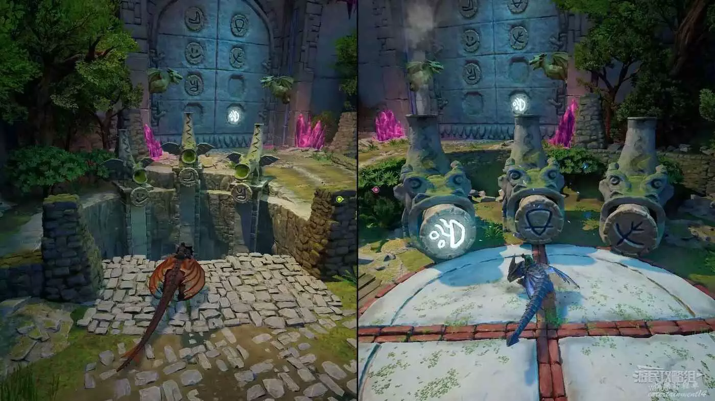 雙影奇境 (Split Fiction) 第五章圖案大門解謎攻略 11 3 月 2025-03-11 廣告 作者:Wioud 來源:遊民星空 後方大門需要進行一個圖案解謎才能開啟,謎題原理很簡單。 先通過紅龍先走到左側噴毒的位置,藍龍走到右側翻滾的位置,紅龍對應左側圖案,藍龍對應右側圖案。 下面只有一個圖案的,右側藍龍撞擊對應圖案即可讓兩個龍雕像上升,然後讓紅龍朝對應圖案吐毒升到第三層。 當圖案有兩個時,左側紅龍需要與右側藍龍同時與對應圖案互動,如果超時龍雕像將回到底層,啟動所有圖案後開啟大門。