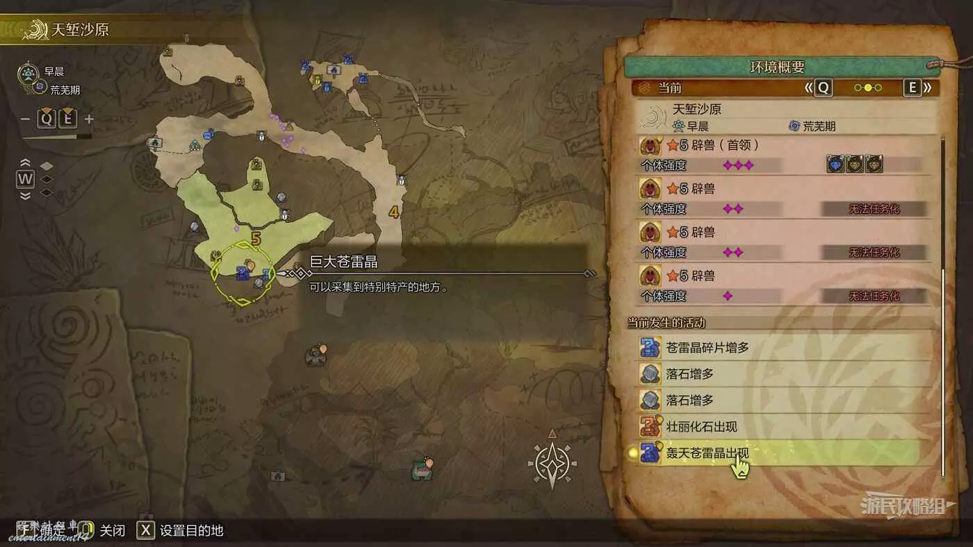 可以通過天塹沙原環境概要中的【轟天蒼雷晶】出現事件來獲得,通過【環境概要】可以查看發生的具體地點,設置目的地後騎乘鷺鷹龍自動尋路並前往即可。