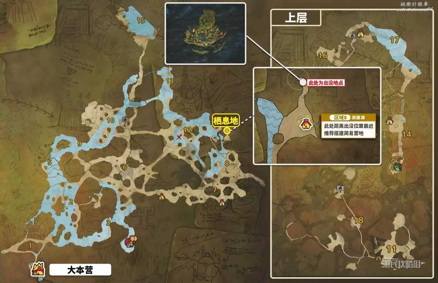 如果古盞蟹沒有出現的話,就移動到另一張地圖,再傳送回古盞蟹出沒位置附近的簡易營地,即可刷新地圖。參考上文中提到的緋紅森林區域8洞窟湖簡易營地。