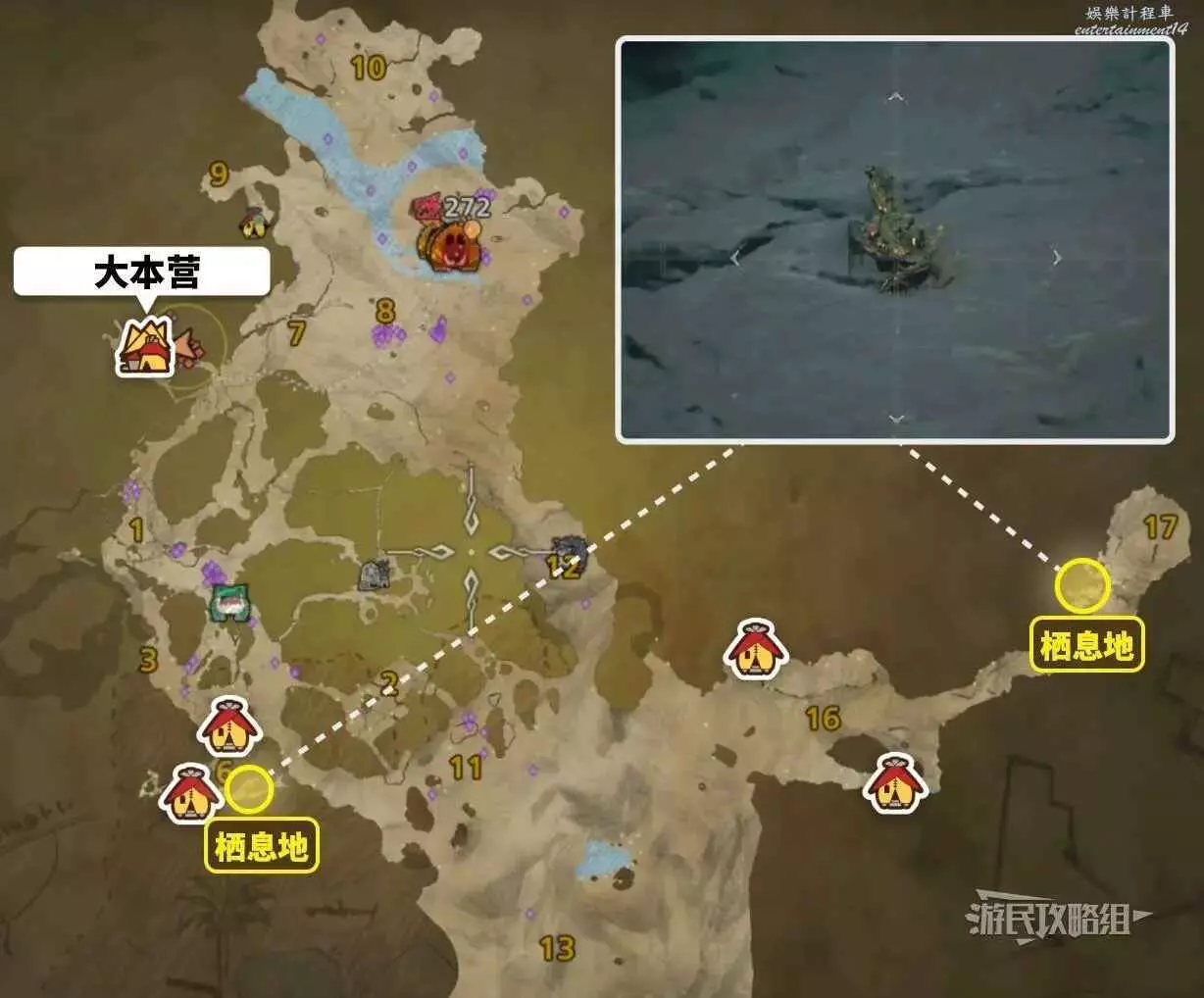 除此之外,古盞蟹在天塹沙原的區域6和區域17也有幾率出現,出沒位置請參考下圖。