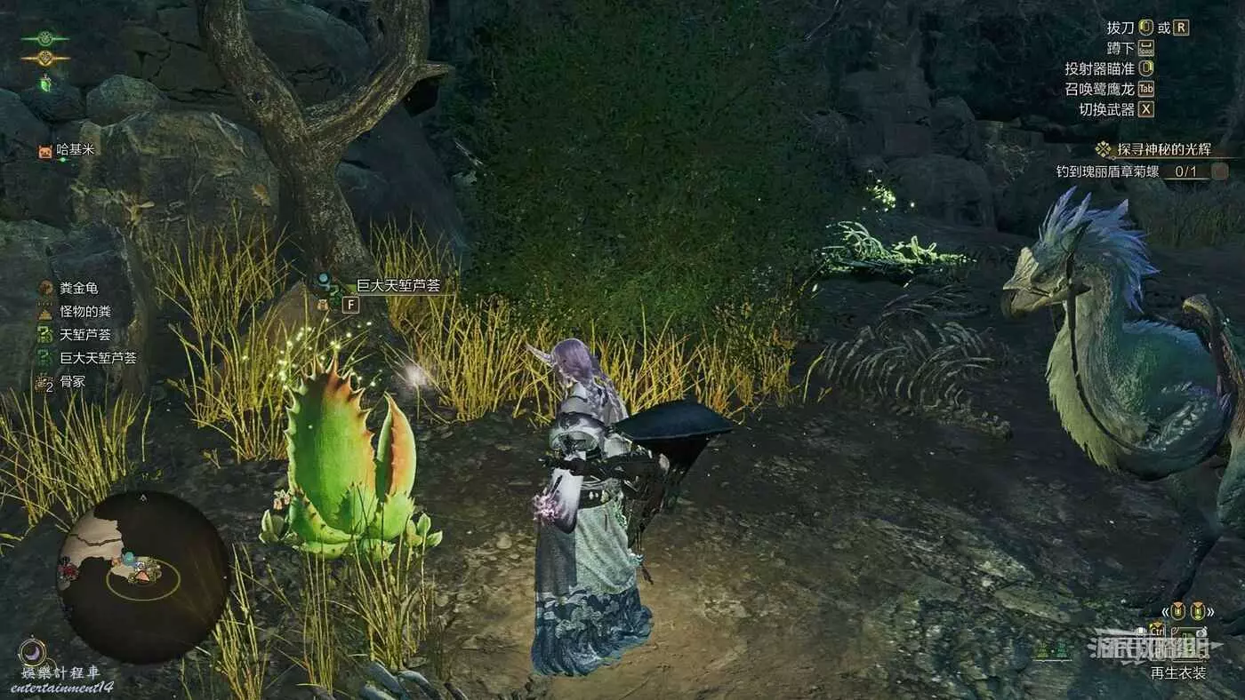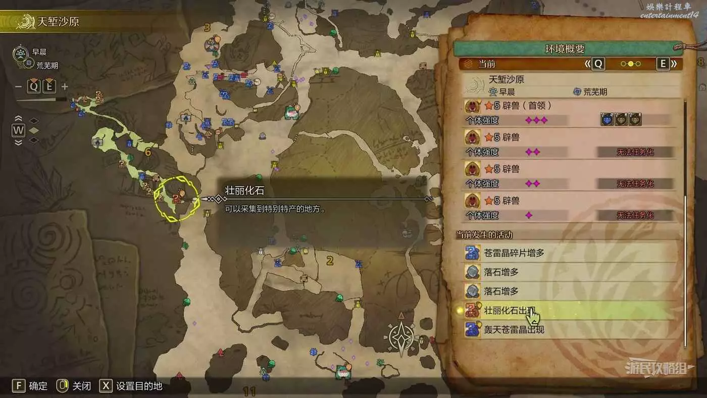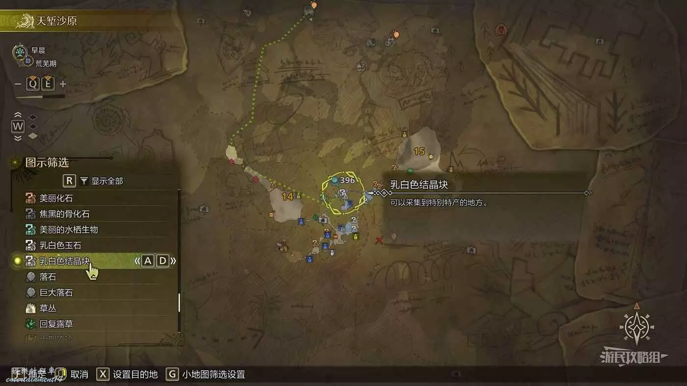在天塹沙原區域14中的【乳白色結晶塊】,它不會出現在【環境概要】中,但可以通過地圖左下角圖示篩選中查看具體點位元,設置區域14中的乳白色結晶塊為目的地後騎乘鷺鷹龍自動尋路並前往即可。