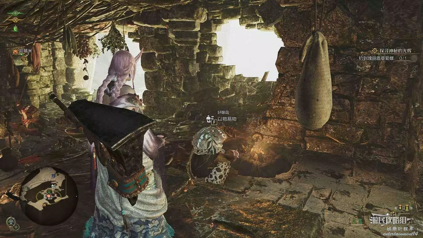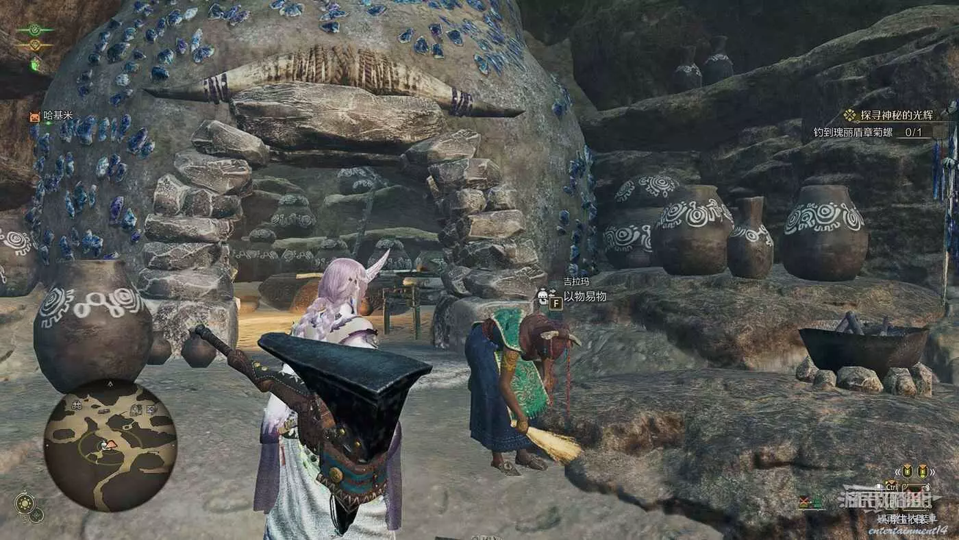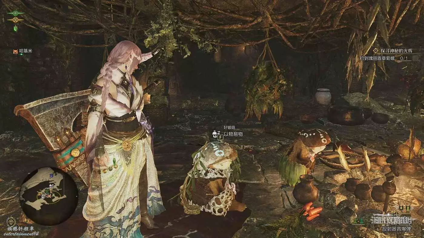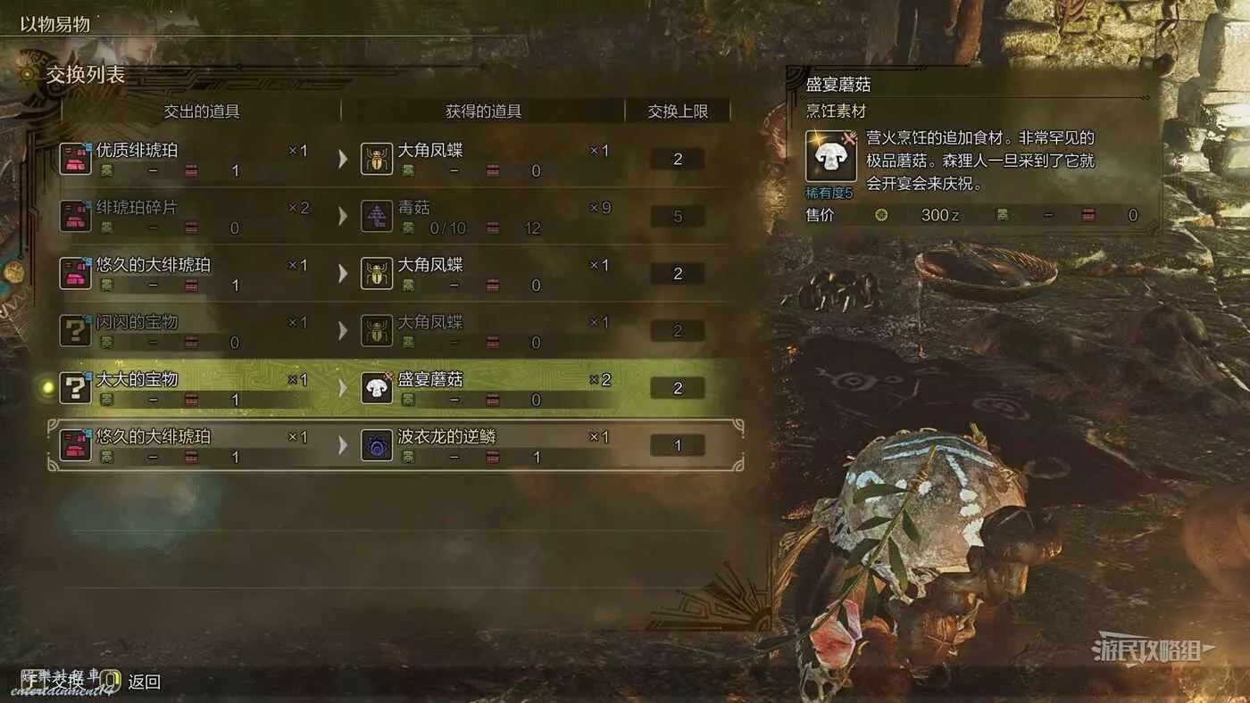 大大的寶物可以用來與緋紅森林【森狸人之家】的【好眼菇】以物換物,交換特殊的防具材料和稀有材料。與好眼菇交談一次後,即可在個人營地中與納塔對話直接進行以物易物,無需再傳送到森狸人之家來進行。注意以物易物的可換道具在每次休息後都會隨機更換。如果沒有找到好眼菇的話,可以在營地休息切換一下晝夜,有些NPC會移動或在某些時段無法交易。