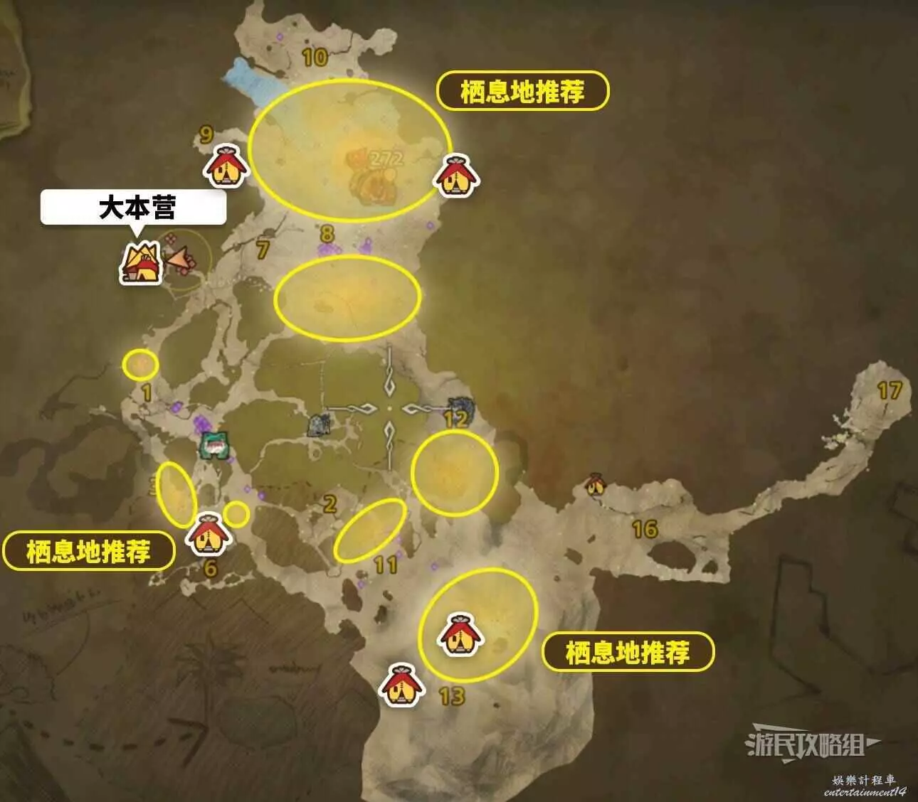 ②參考上文地圖,在天塹沙原2個刷新點位附近搭建簡易營地(區域10東南部、區域3南部)