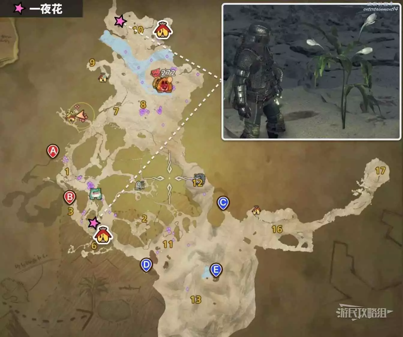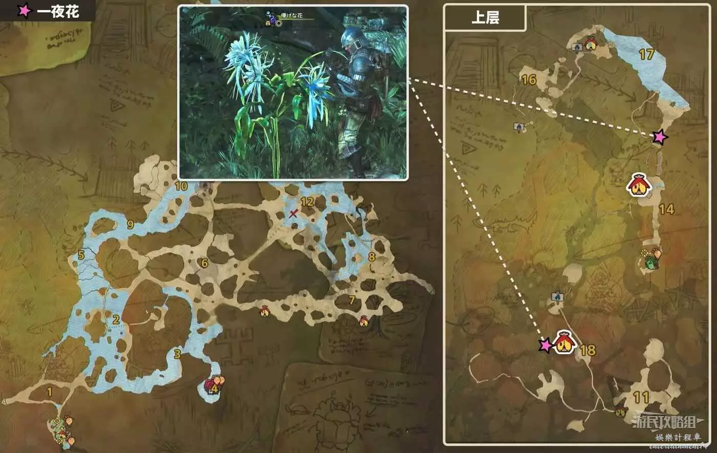 一夜花會在滿月的夜晚出現在天塹沙原和緋紅森林地圖整理,每張地圖上都有2個刷新點位。一夜花不會出現在環境概要中,但可以通過左下角的圖示篩選確認是否在地圖上出現。