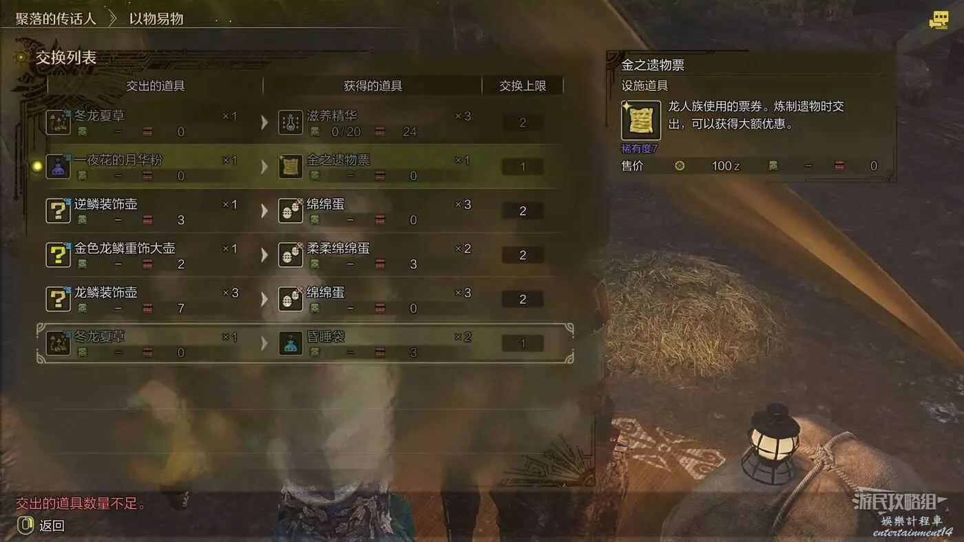 金色龍鱗重飾大壺可以用來與【交匯之峰酥加】的【雪華】交換特殊防具素材或稀有食材,與雪華對話一次後,即可在個人營地中與納塔對話直接進行以物易物,無需再傳送到交匯之峰酥加來進行。注意以物易物的可換道具在每次休息後都會隨機更換。