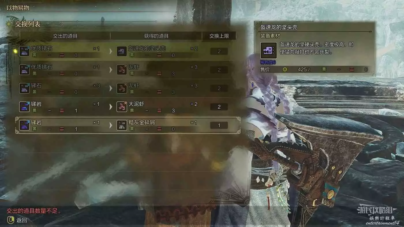 銻岩可以用來與火窯村阿孜茲中的【多格德】以物換物,可以用來交換特殊的防具材料和稀有材料。主線推進至章節4-1之後,與多格德交談一次後,即可在個人營地中與納塔對話,直接進行以物易物,無需再傳送到火窯村來進行。可交換的素材有:黯灰金碎屑、大泥蝦等。注意以物易物的可換道具在每次休息後都會隨機更換。