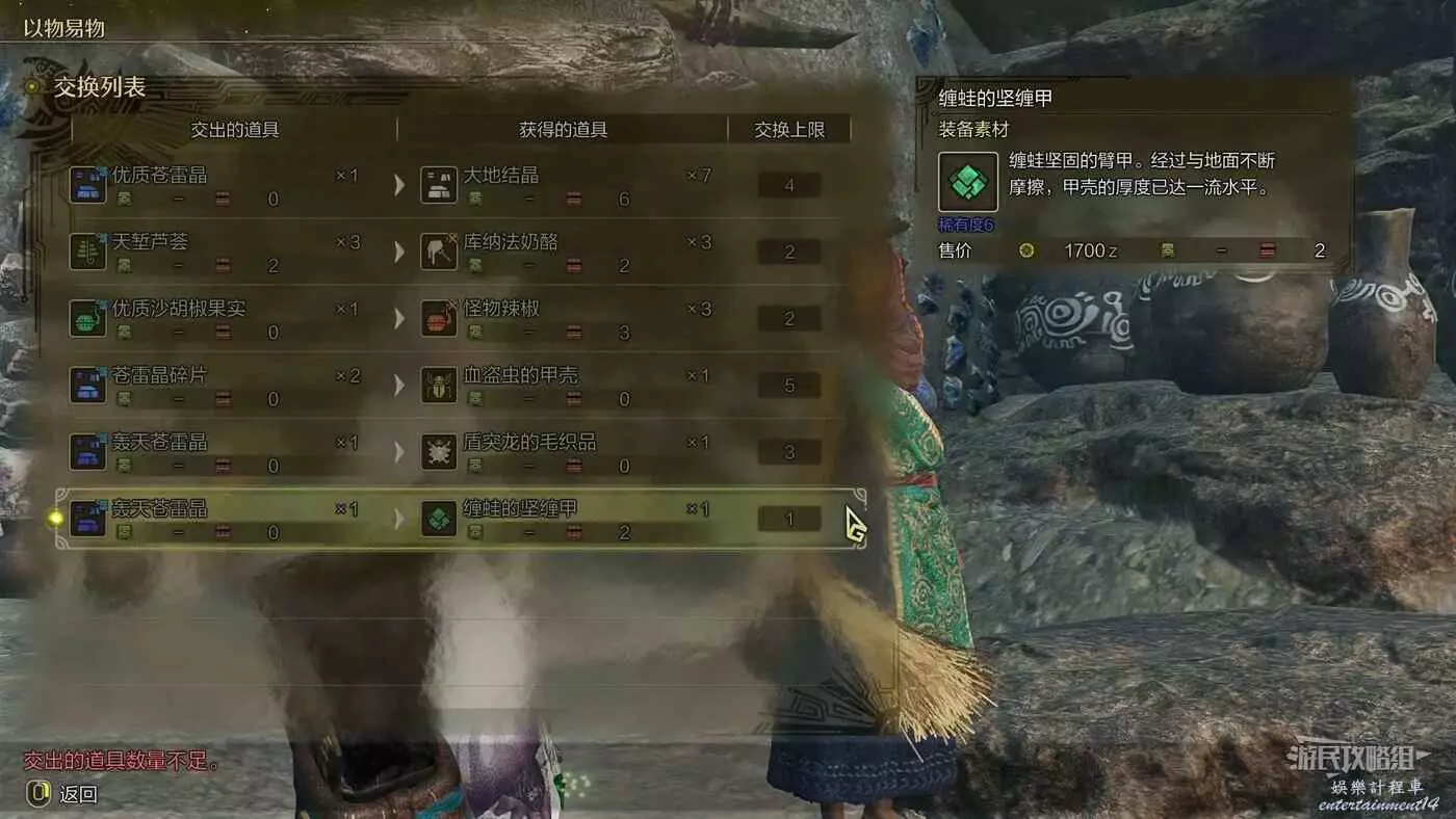 轟天蒼雷晶可以用來與天塹沙原【風音村庫納法】的【吉拉瑪】(白晝)交換特殊防具素材,與她對話一次後,即可在個人營地中與納塔對話直接進行以物易物,無需再傳送到風音村庫納法來進行。注意以物易物的可換道具在每次休息後都會隨機更換。