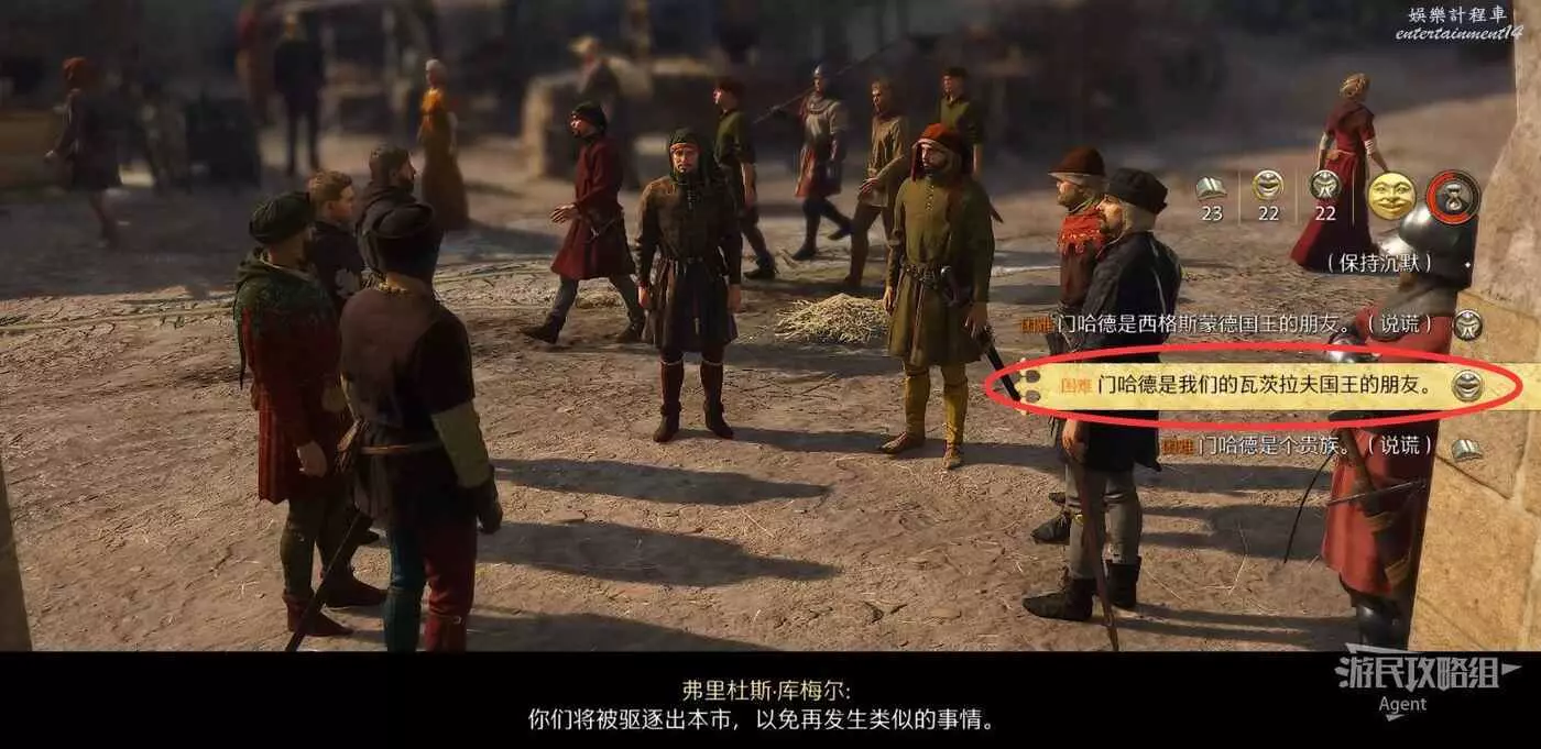 和一群人爭論時,最好如實說出瓦茨拉夫國王,說服幾率會高些。說服成功後,在被詢問“怎麼冒犯了門哈德”時,選擇有說服力的原因(比如女兒)可以避免被罰款。