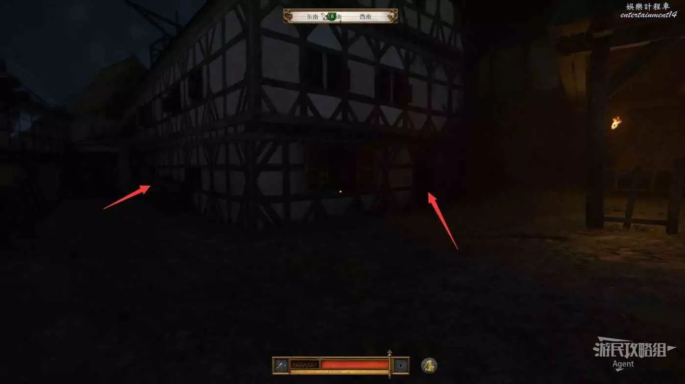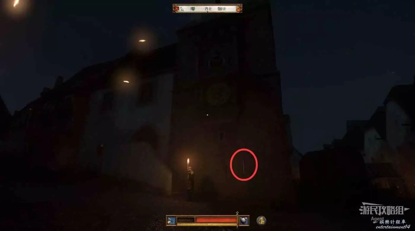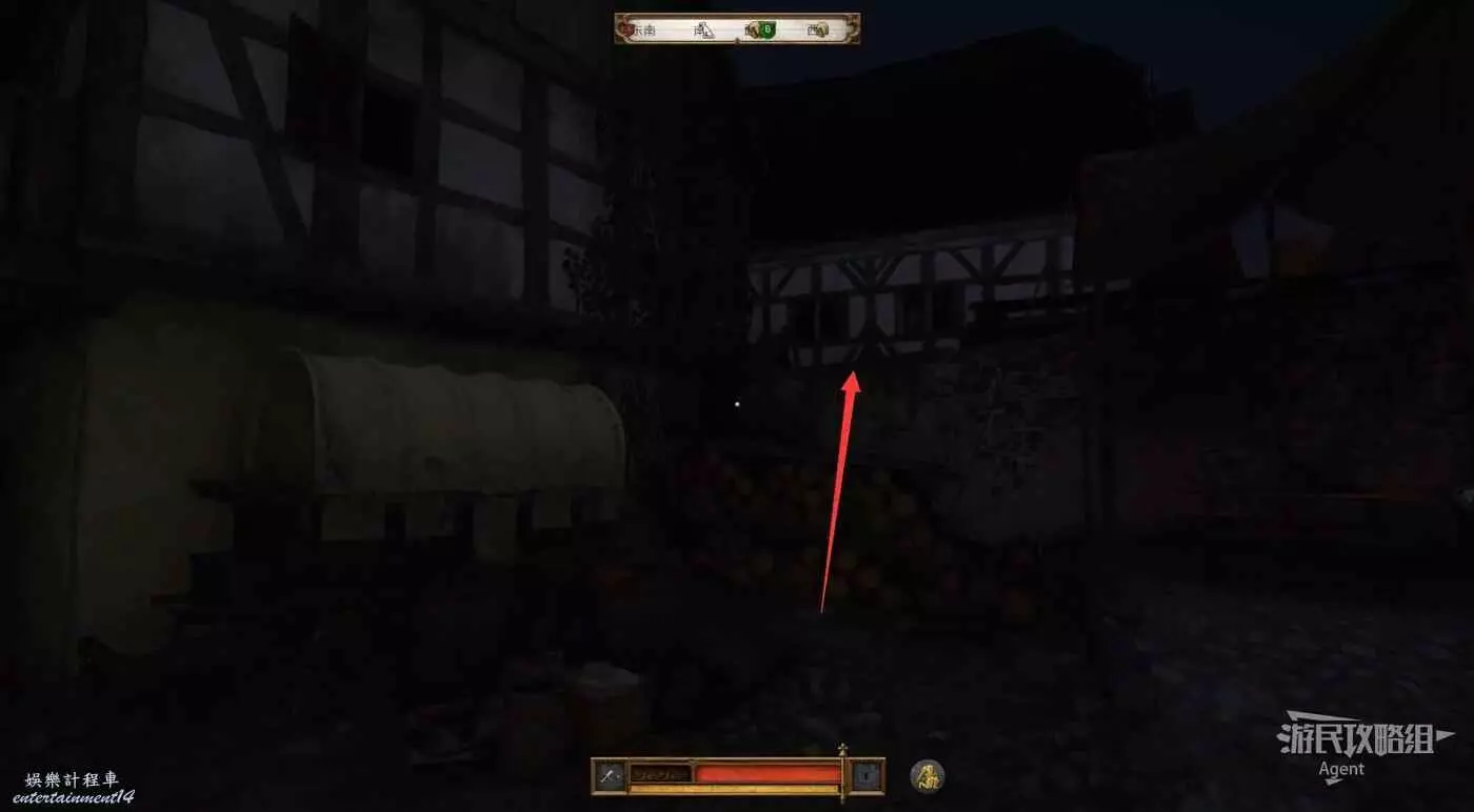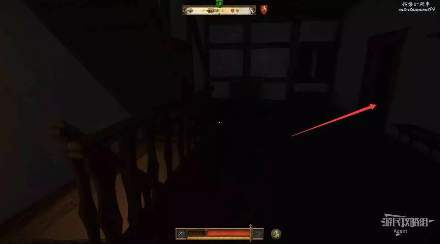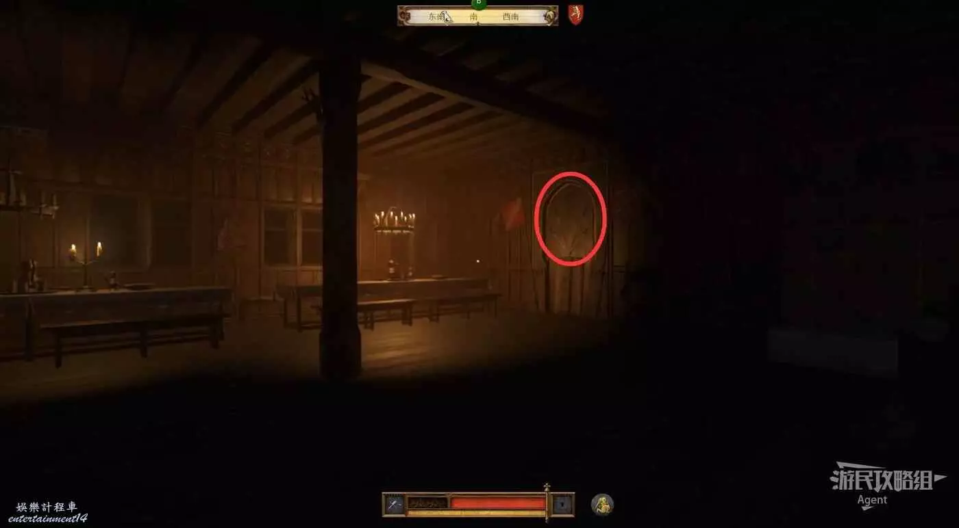 走樓梯上二樓,在下圖所示的餐廳牆上,偷到公會長劍。偷的過程要避免被人發現。