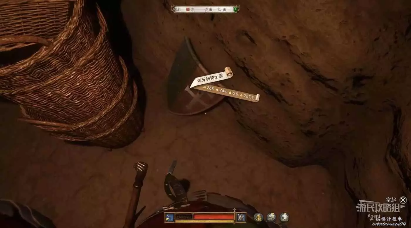 在不遠處的棚子裡發現藏著的物資和另一個士兵的盾牌。