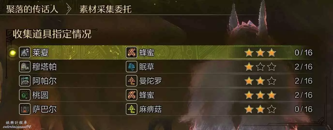 狩獵湧油谷的上位沼噴龍後在火窯村阿孜茲薩巴爾處解鎖收集指定道具。