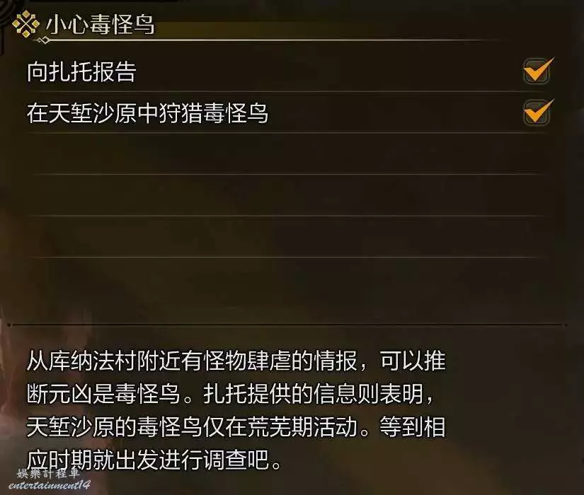 在庫納法村接到紮托的小心毒怪鳥任務。