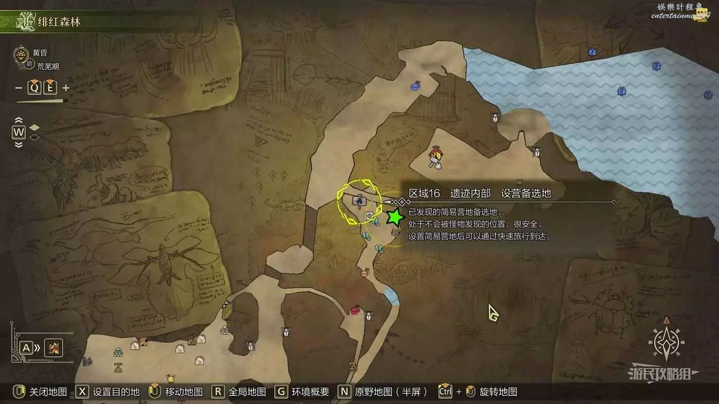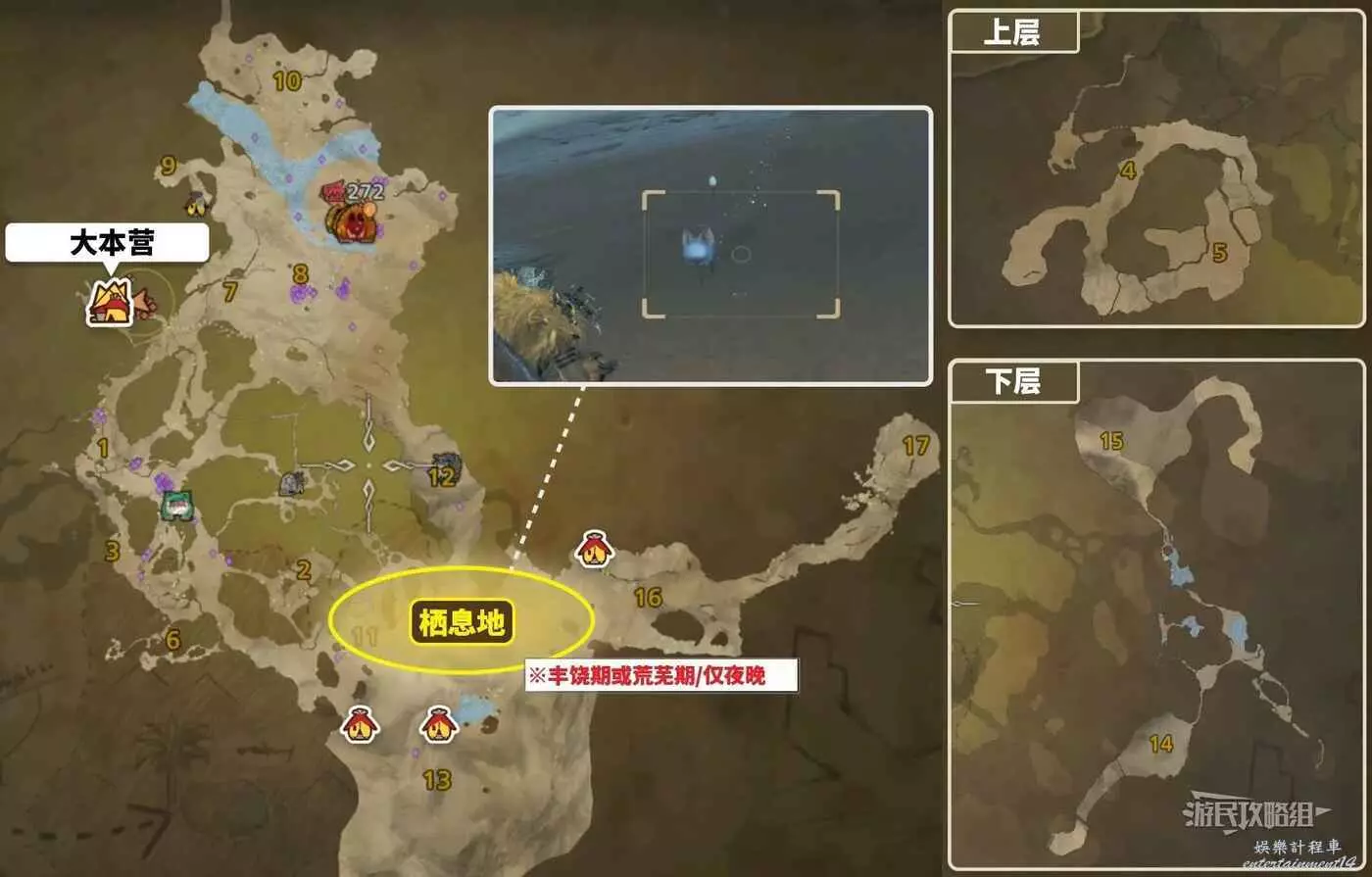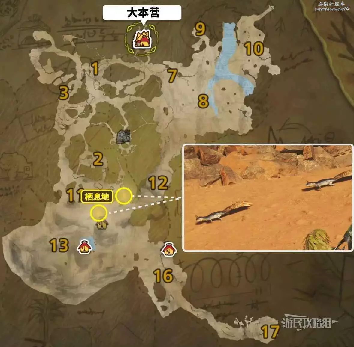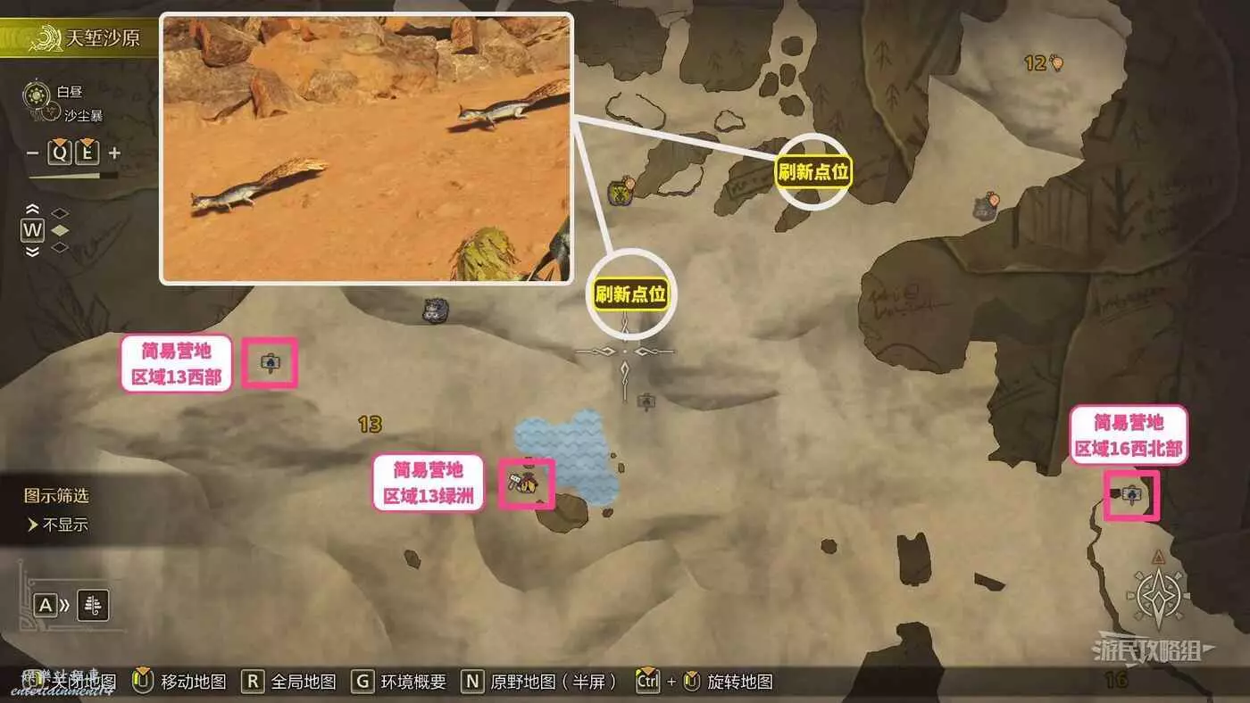 目前已經確認足跡蜥蜴無論在什麼環境狀態下,都會在圖示位置刷新,附近有幾個簡易營地點位,選擇其中一個位置搭建簡易營地會更容易前往。