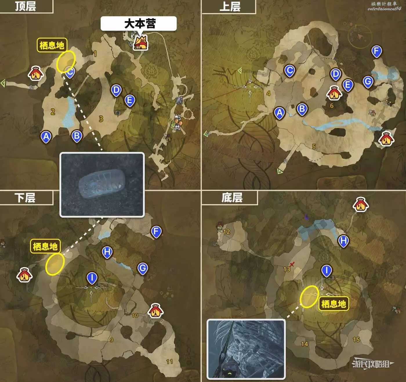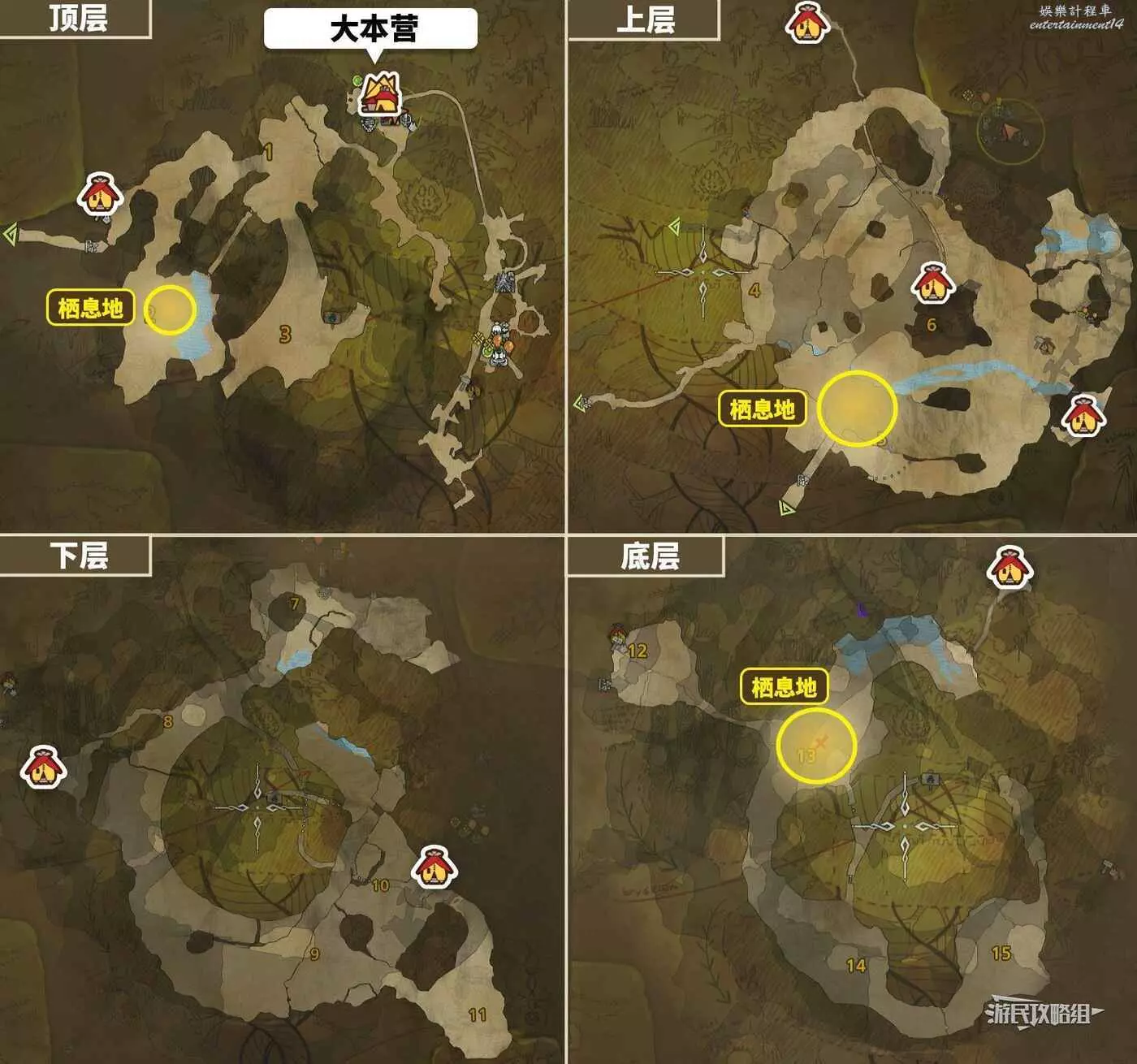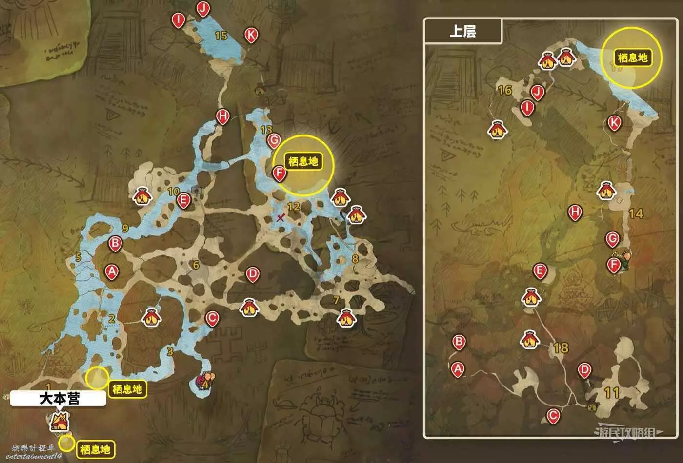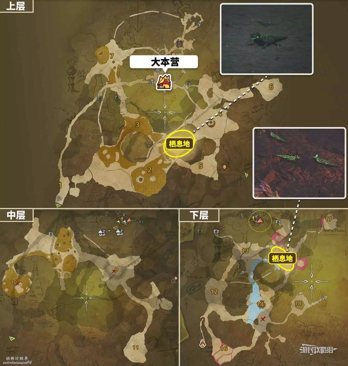 目前已經確認足跡蜥蜴無論在什麼環境狀態下,都會在圖示位置刷新,附近有幾個簡易營地點位,選擇其中一個位置搭建簡易營地會更容易前往。