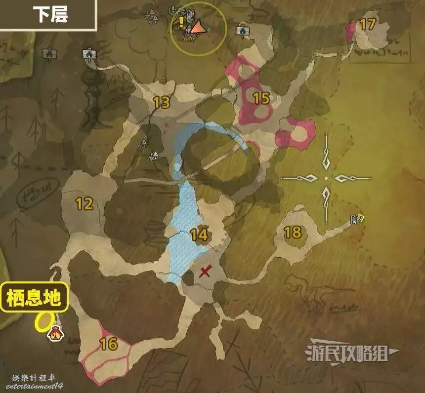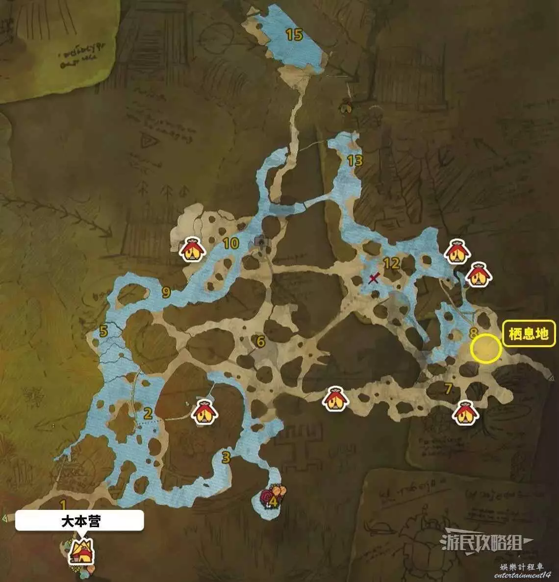 黃金魚的刷新地點有很多,推薦前往緋紅森林區域6、區域8、區域16的三個釣魚點(參考下方地圖綠色星標位置),附近都有簡易營地,移動方便,並且出現數量較多。除此之外,天塹沙原區域14的水域也有幾率出現黃金魚,但出現幾率比緋紅森林的釣魚點要低一些。