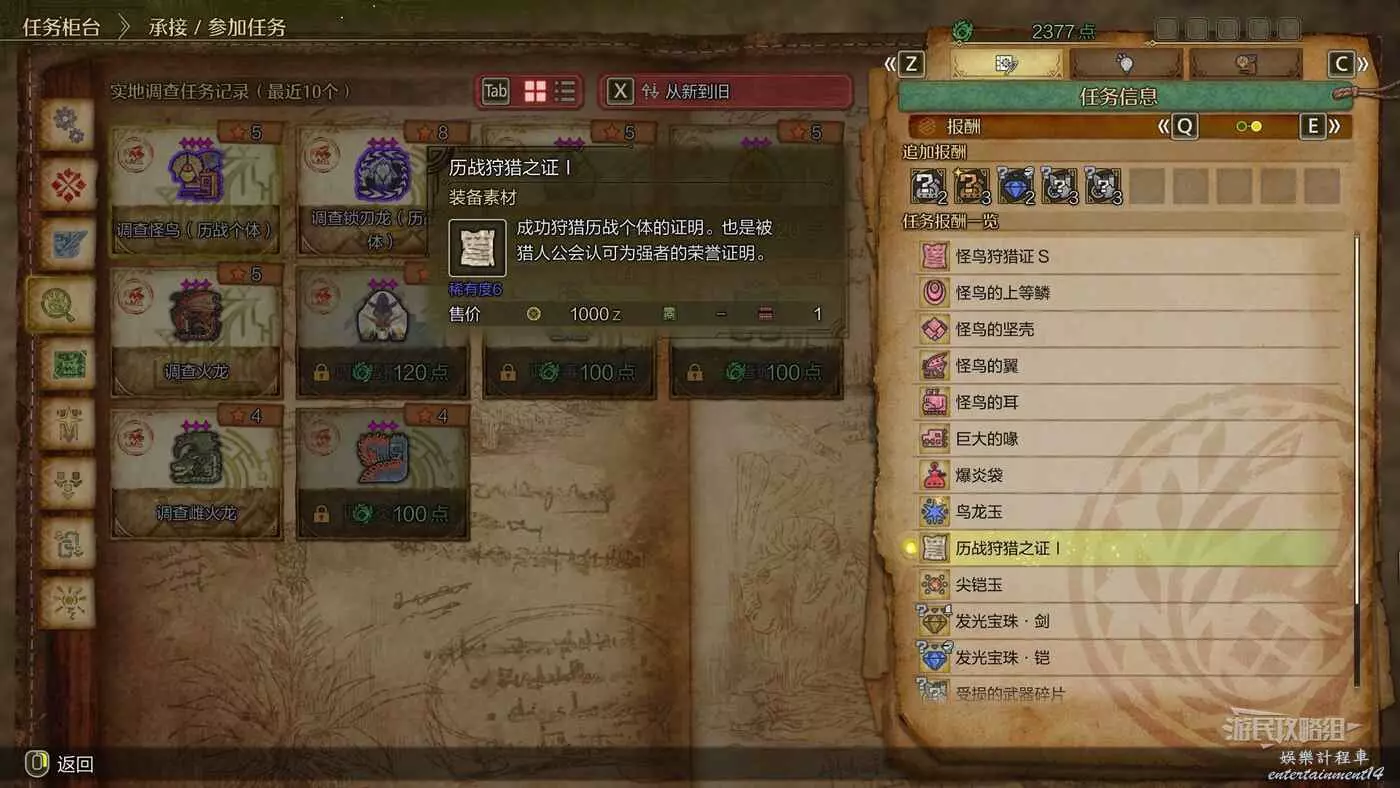 曆戰狩獵之證1可以用來生產/強化武器。