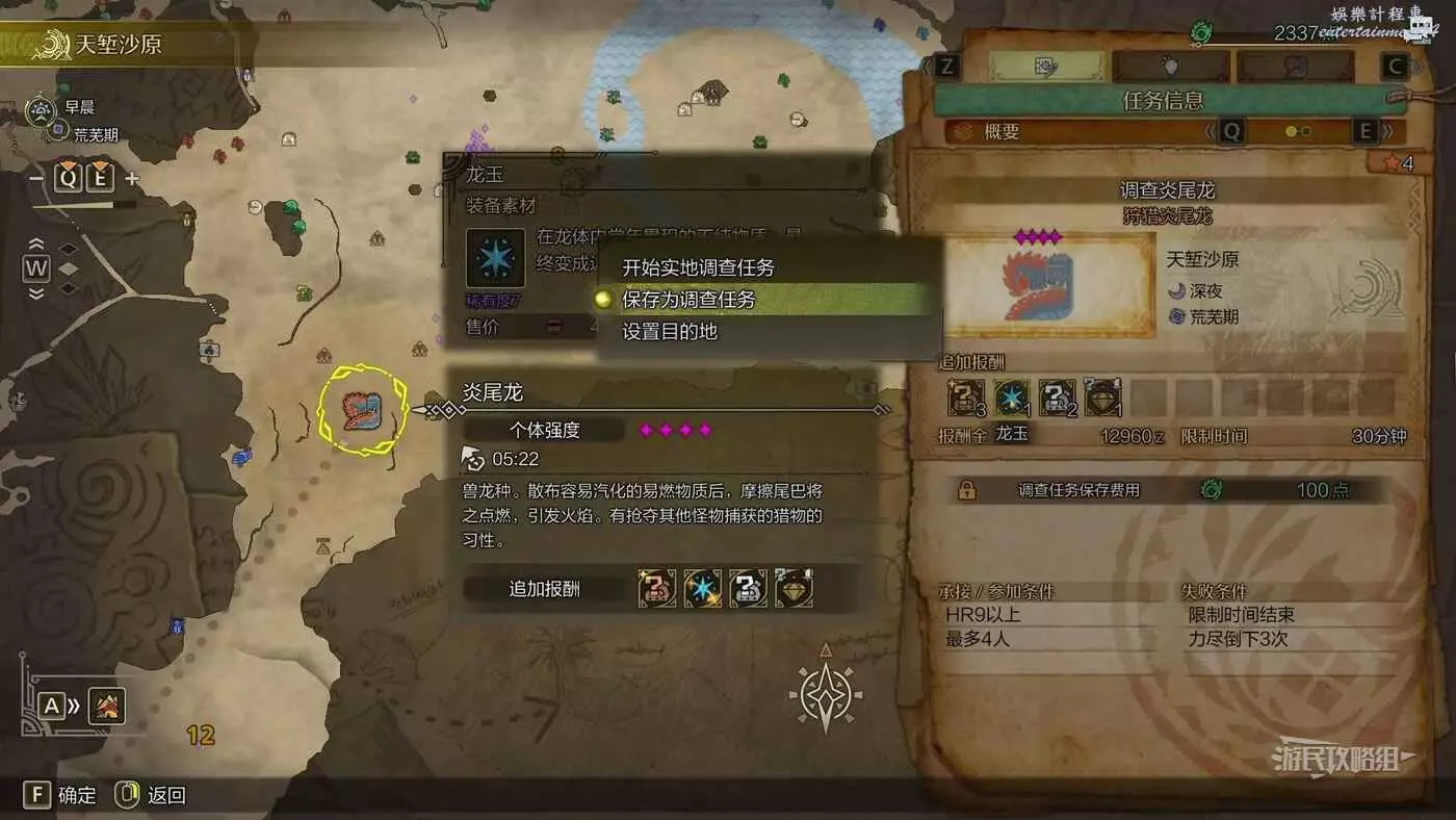 如果上述怪物沒有出現在地圖中,可以通過在營地休息來刷新地圖,找到怪物後可以將其保存為調查任務,保存的任務最多可以狩獵3次,能夠在一定程度上提升獲得稀有材料的幾率。如果忘了保存成調查任務的話,也可以從任務櫃台的歷史記錄中將其轉化成調查任務。