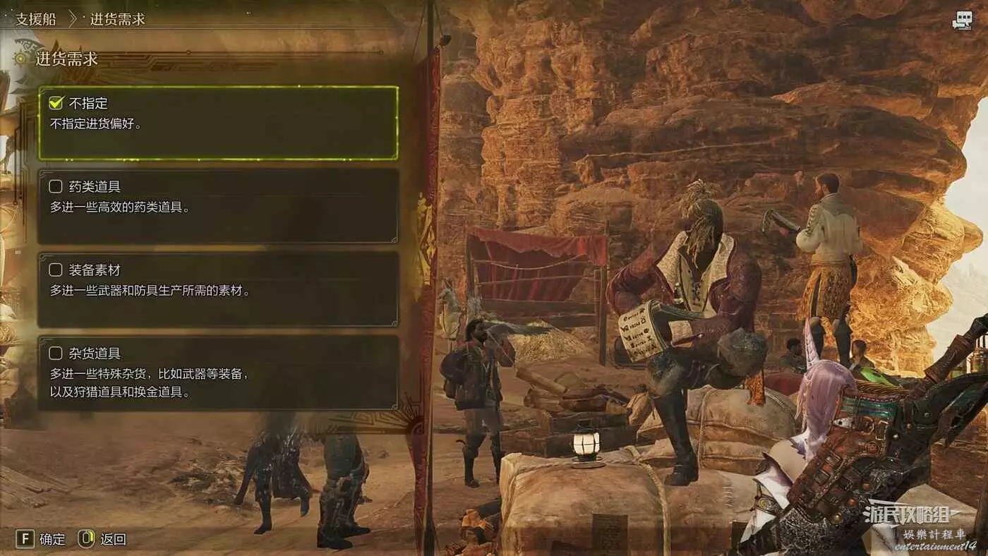 與支援船店主【桑提亞哥】對話選擇【進貨需求】可以更改支援船商品列表的傾向,選擇的需求不同,進貨需要的時間也有所區別,但差別不大,例如將需求改為【裝備素材】,所需時間大約為19分鐘;改為【雜貨道具】則所需時間大約為23分鐘。不過無論選擇哪個需求類型,都不會影響調查團票的出現幾率。