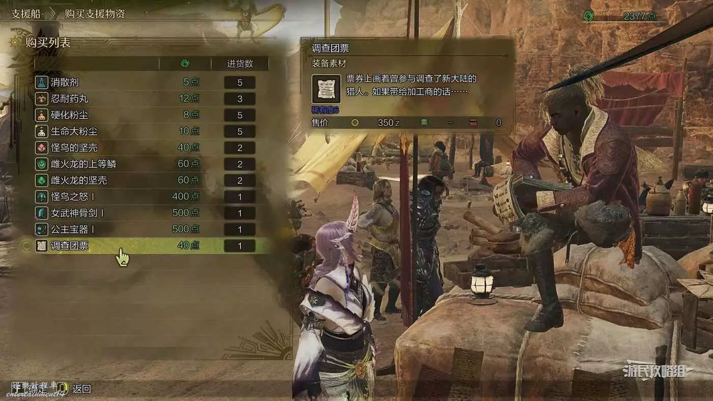 支援船抵達後,查看商品列表,如果有調查團票的話,則購買調查團票並返回步驟1;沒有頭出現調查團票的話繼續看步驟3。