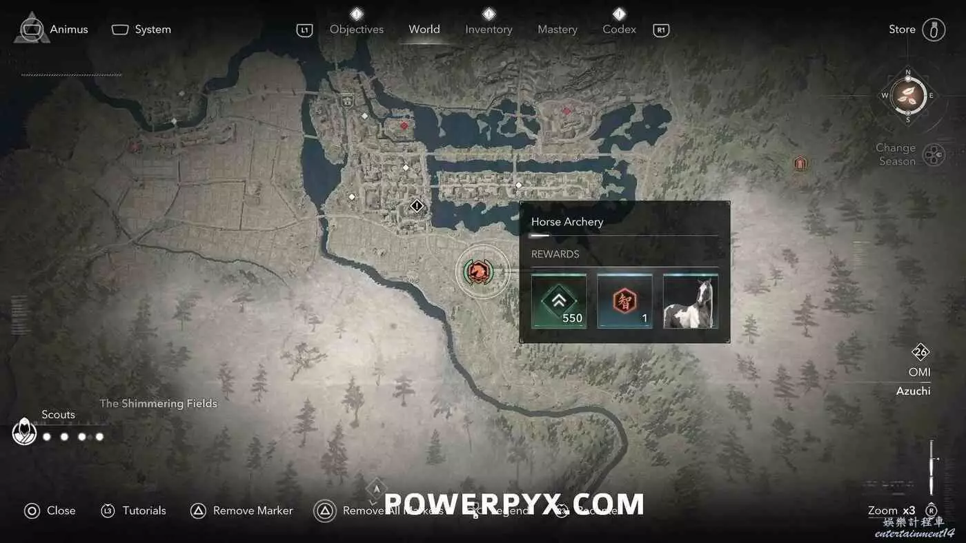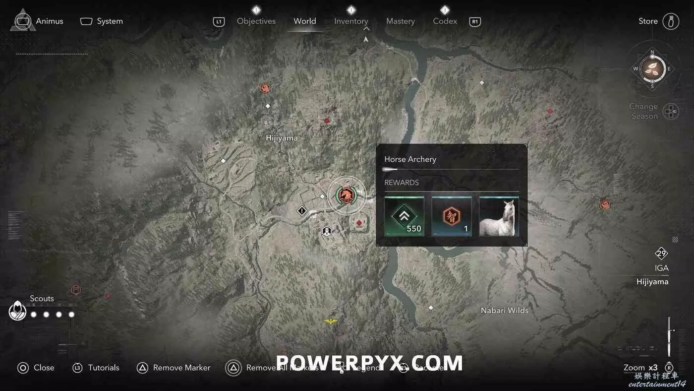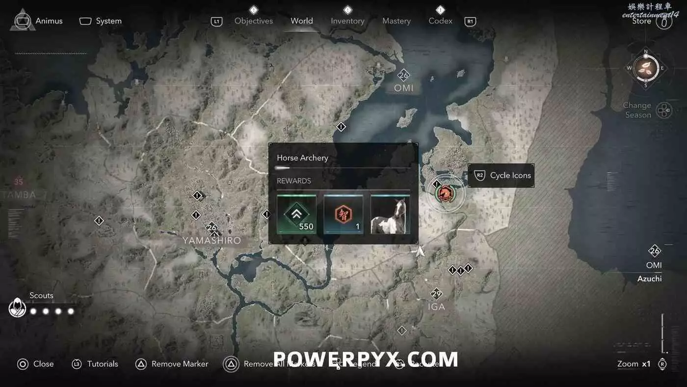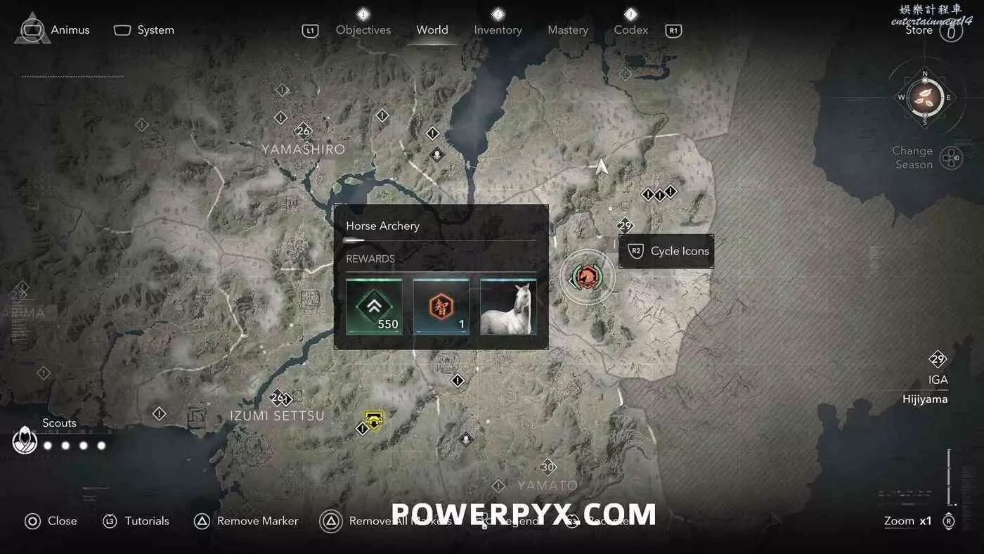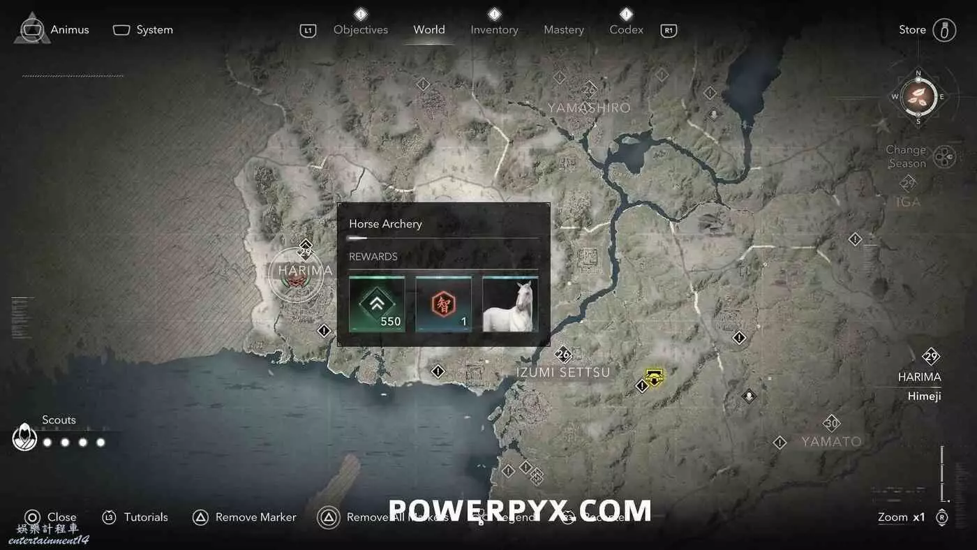 騎射是彌助專屬的收集要素,無法在扮演奈緒江時收集,完成主線第一章後,即可解鎖彌助作為可操作角色。騎射在地圖上會以白色問號標記顯示,靠近時就會變成橙色的馬頭圖示。前往騎射位置後會觸發簡短的騎馬場景,需要在移動過程中射擊目標,只需要擊中大多數目標即可過關,但想獲得滿分的話就需要全部射中。目標數量會以白點的形式顯示在介面下方,完成後可以獲得知識點、經驗值或新的馬匹裝飾等獎勵。如果是以奈緒江的身份前往的話,可以在物品欄按住【□鍵/X鍵】來切換成彌助再進行收集。