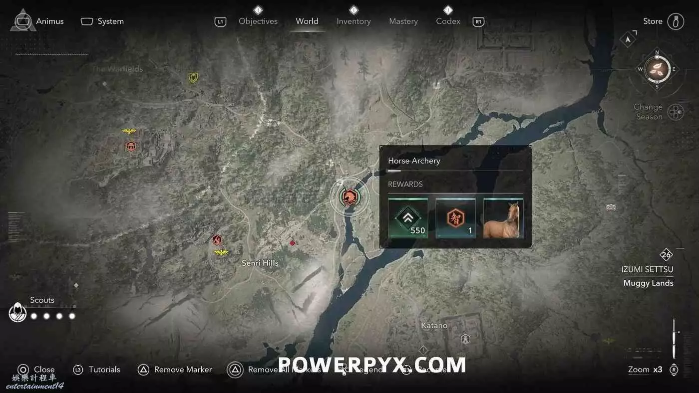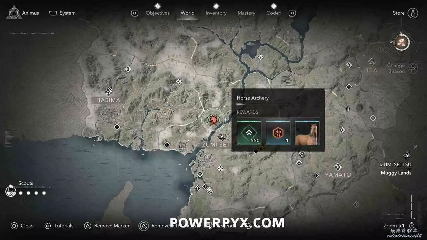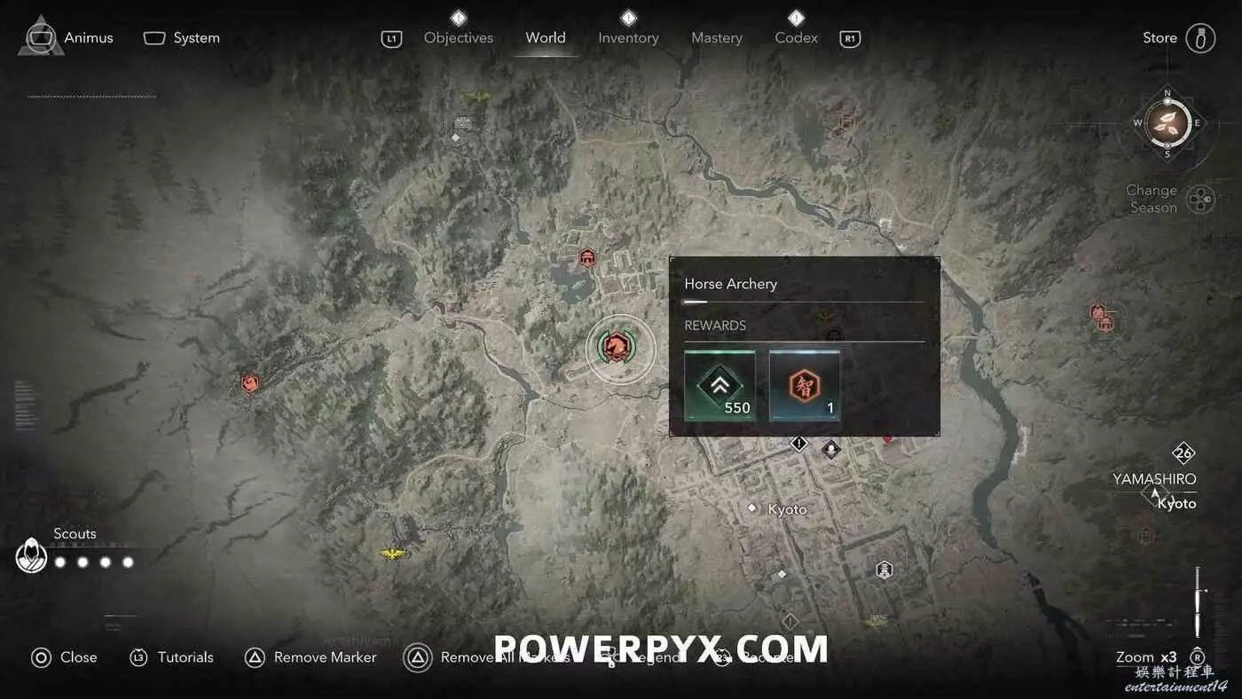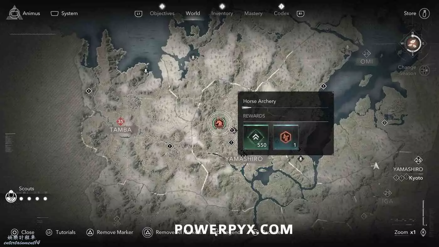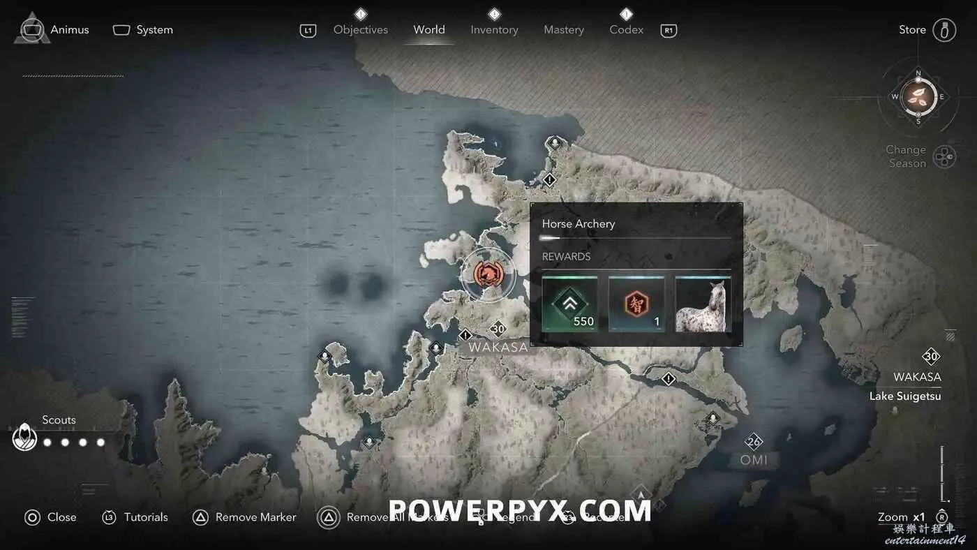 騎射是彌助專屬的收集要素,無法在扮演奈緒江時收集,完成主線第一章後,即可解鎖彌助作為可操作角色。騎射在地圖上會以白色問號標記顯示,靠近時就會變成橙色的馬頭圖示。前往騎射位置後會觸發簡短的騎馬場景,需要在移動過程中射擊目標,只需要擊中大多數目標即可過關,但想獲得滿分的話就需要全部射中。目標數量會以白點的形式顯示在介面下方,完成後可以獲得知識點、經驗值或新的馬匹裝飾等獎勵。如果是以奈緒江的身份前往的話,可以在物品欄按住【□鍵/X鍵】來切換成彌助再進行收集。