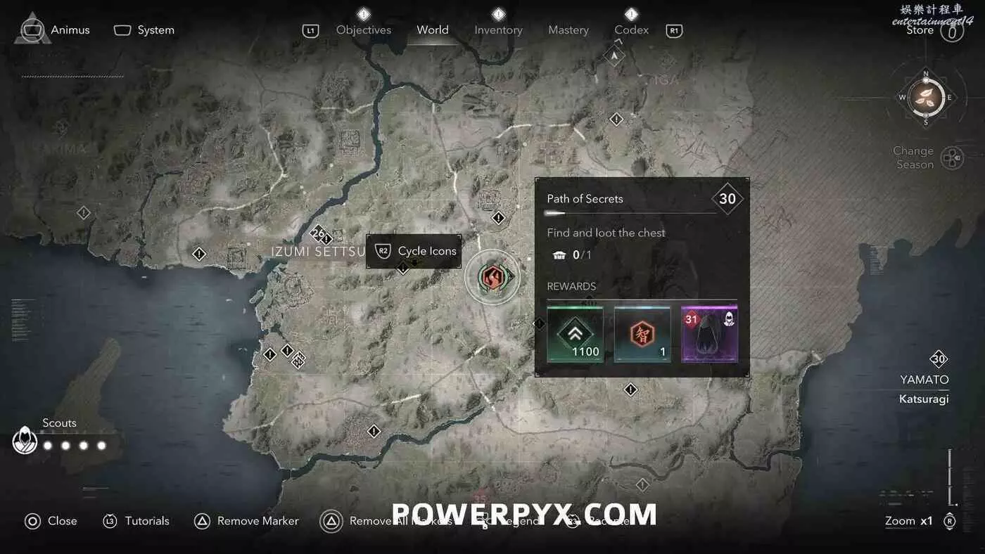 秘道在地圖上會以白色問號顯示,靠近時問號就會變成橙色的秘道圖示。秘道是一段奈緒江的跑酷場景,到達終點後可以開啟一個寶箱,開啟寶箱即可視作成功收集。跑酷期間會有黃色標記指引,很容易就能找到方向。橙色圖示標記位置為起點。完成秘道可以獲得奈緒江的裝備、知識點和經驗值。如果是以彌助的身份前往的話,可以在物品欄按住【□鍵/X鍵】來切換成奈緒江再進行挑戰。