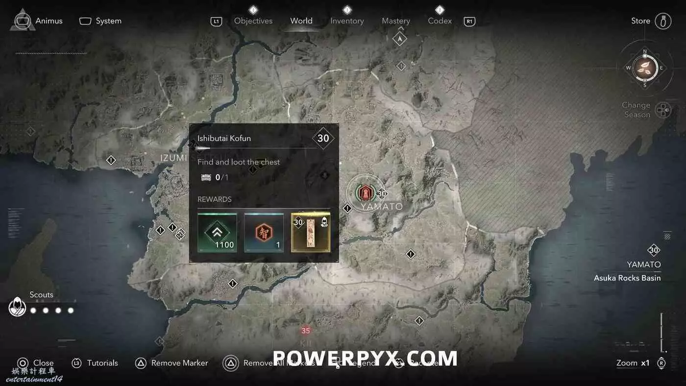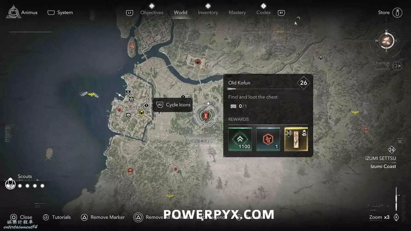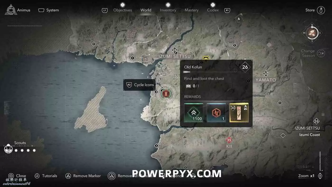 古墳在地圖上會以白色問號標記顯示,靠近時就會變成橙色的古墳圖示。古墳類似於一個小地牢,在盡頭可以找到一個傳奇寶箱,完成後可以獲得知識點、經驗值或傳奇裝備(具體獎勵內容受角色當前等級影響)。其中部分古墳只能在扮演奈緒江或彌助時才能攻略(彌助需要完成主線第一章之後才能解鎖),可以在物品欄按住【□鍵/X鍵】來切換角色。還有一些古墳需要使用抓鉤,也就是需要扮演奈緒江才能完成,可以通過在地圖上查看古墳的詳細說明來確定所需角色(傳奇道具上會顯示奈緒江的兜帽或彌助的頭盔)。如果卡關也可以考慮切換角色來繼續攻略。